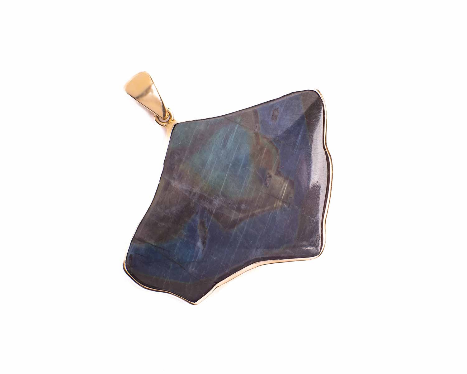 Złota zawieszka o nieregularnym kształcie ze spektrolitem, którego masa karatowa to aż 30 ct!