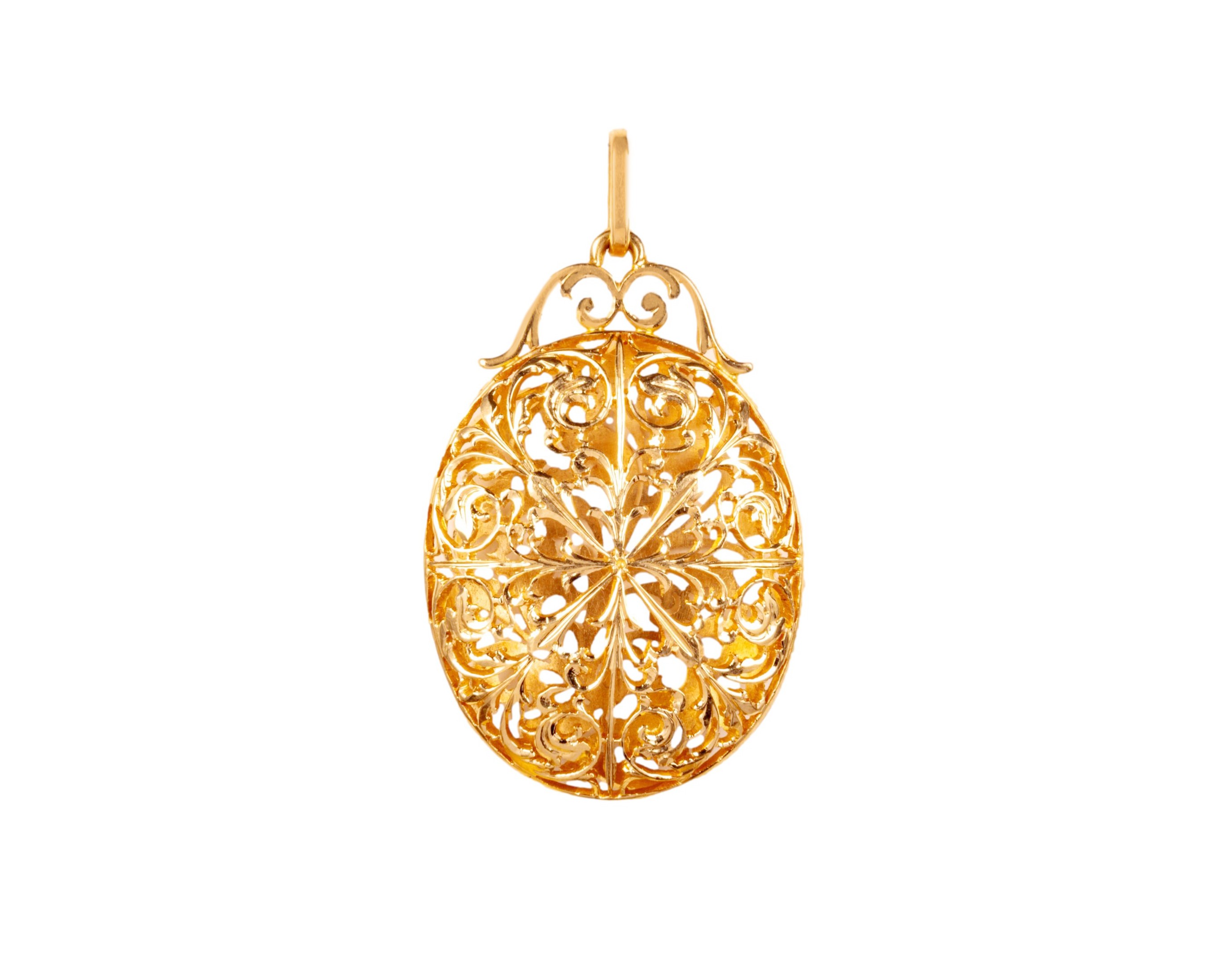 Złota, owalna zawieszka o ażurowej budowie, dekorowanej obustronnie roślinnym motywem. Wymiary zawieszki to ok. 3,6 na 2 cm, zawieszka jest nieotwierana. Całość wykonana z żółtego złota.