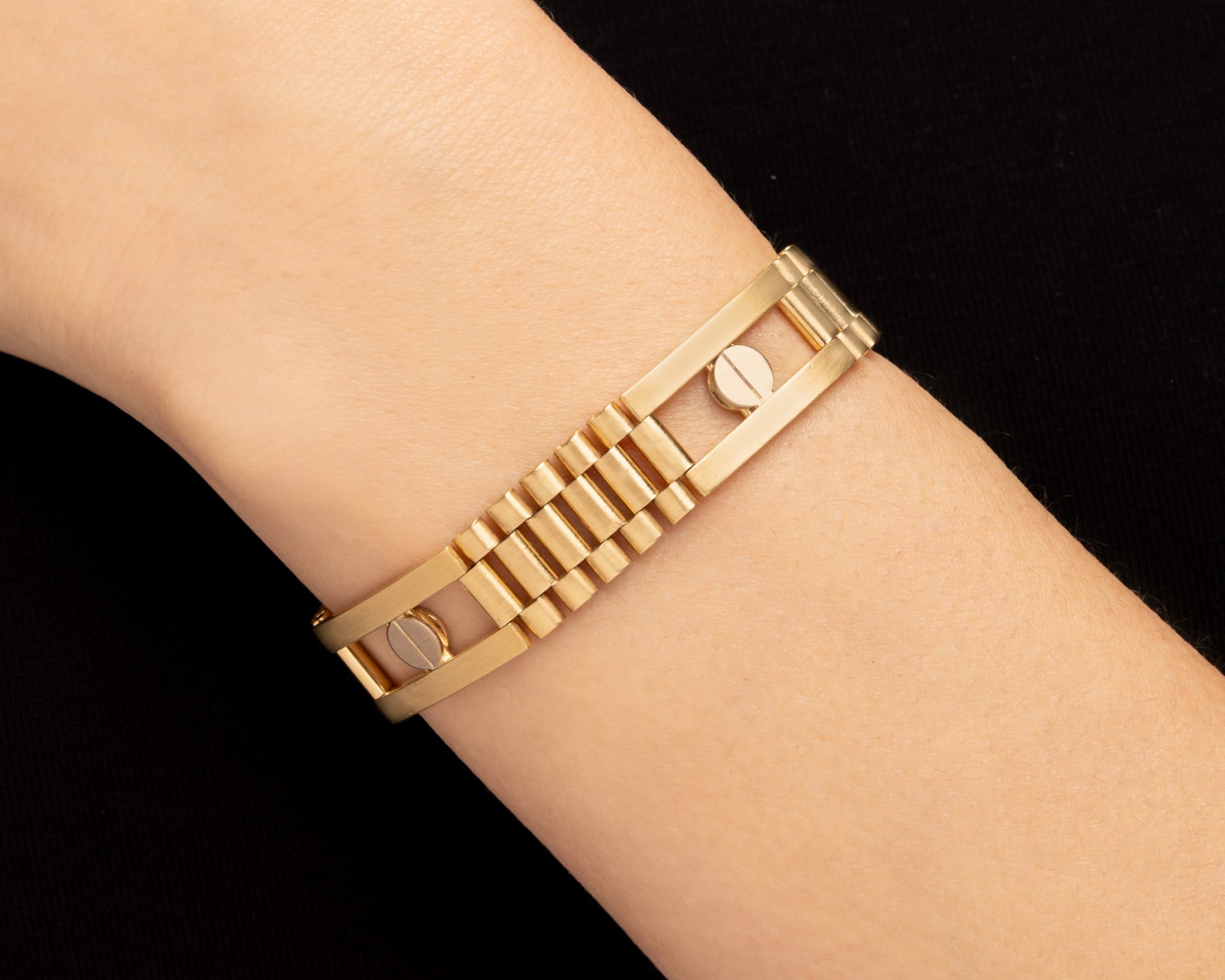 Złota bransoleta z ciekawym wzorem, z klasycznym zapięciem na szufladkę i bocznym zabezpieczeniem. Powierzchnia bransolety jest zmatowiona, a całość wykonana w żółtym złocie próby 583, długość ok. 19,5 cm.