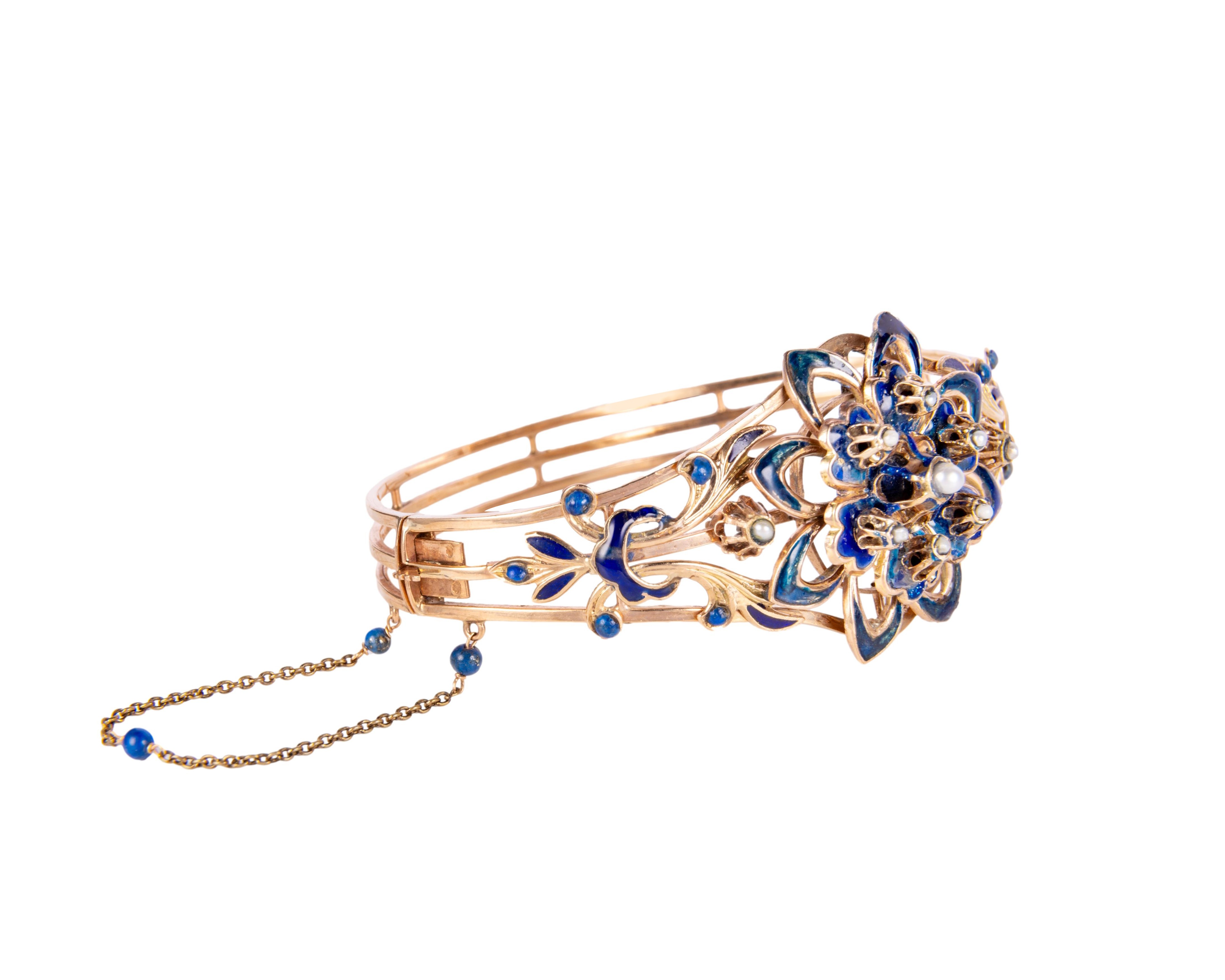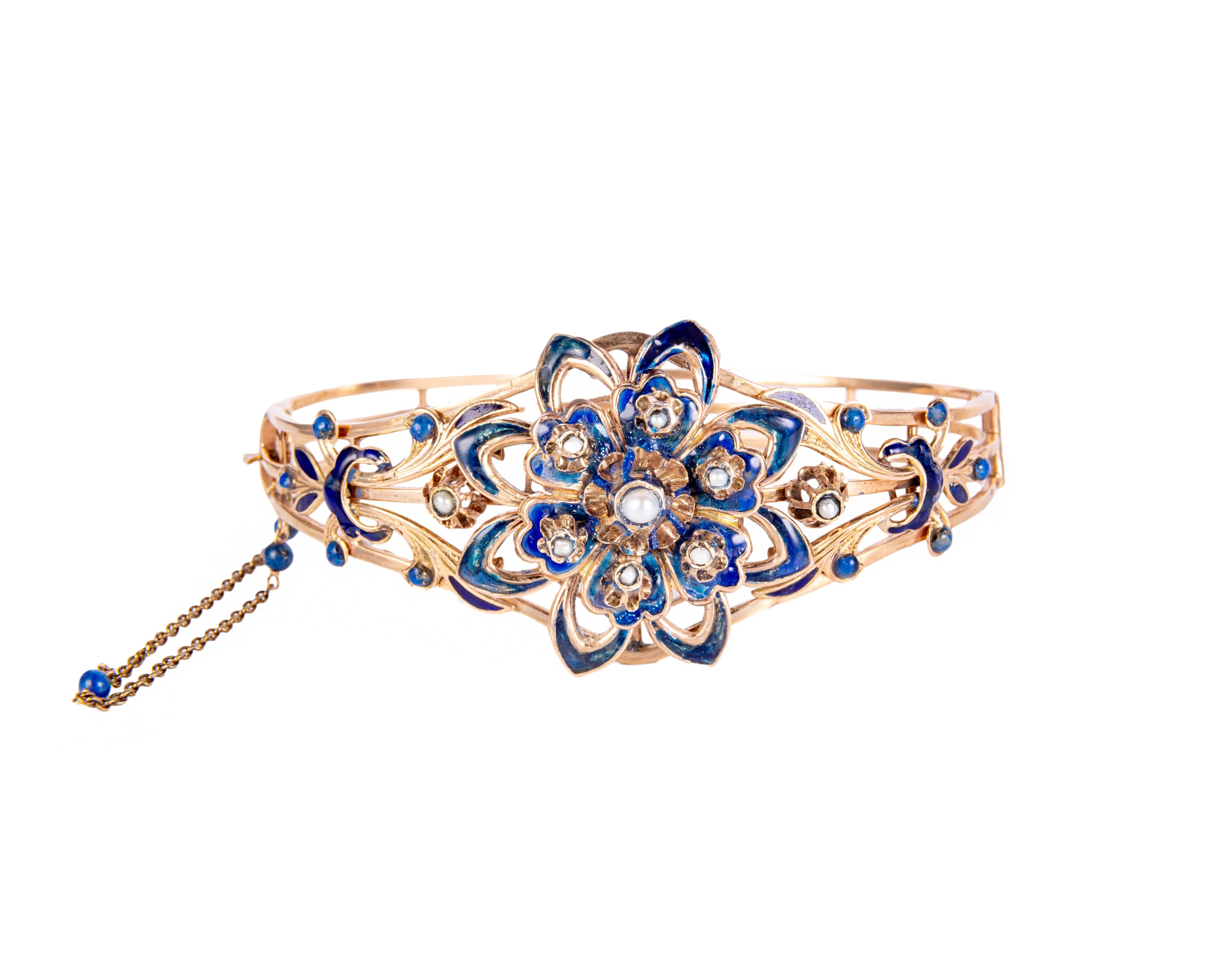 Wyjątkowa, sztywna bransoleta z motywem florystycznym. Zdobiona granatową emalią i perełkami. Zapinana na klasyczną szufladkę z łańcuszkiem zabezpieczającym. Całość wykonana ze złota o wewnętrznych średnicach ok. 7x5 cm.