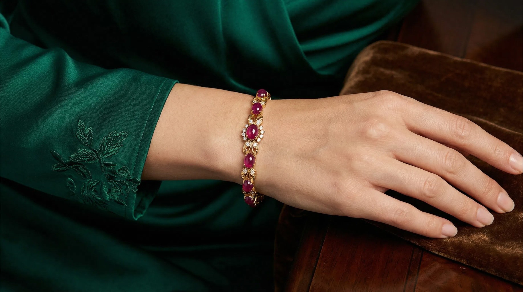 Piętnaście rubinów w klasycznym szlifie kaboszon – gładko wypolerowanych, bez faset – prezentuje głęboką, satynową czerwień charakterystyczną dla najszlachetniejszych rubinów. Wokół każdego rubinu tańczą diamenty, tworząc kwiatowe motywy pełne blasku i życia. Czterdzieści diamentów jak iskry światła podkreśla majestat rubinów, a ciepłe żółte złoto mieszanej próby stanowi idealną oprawę dla tej królewskiej kompozycji. Rubin to kamień królewski – symbol miłości, pasji i władzy.