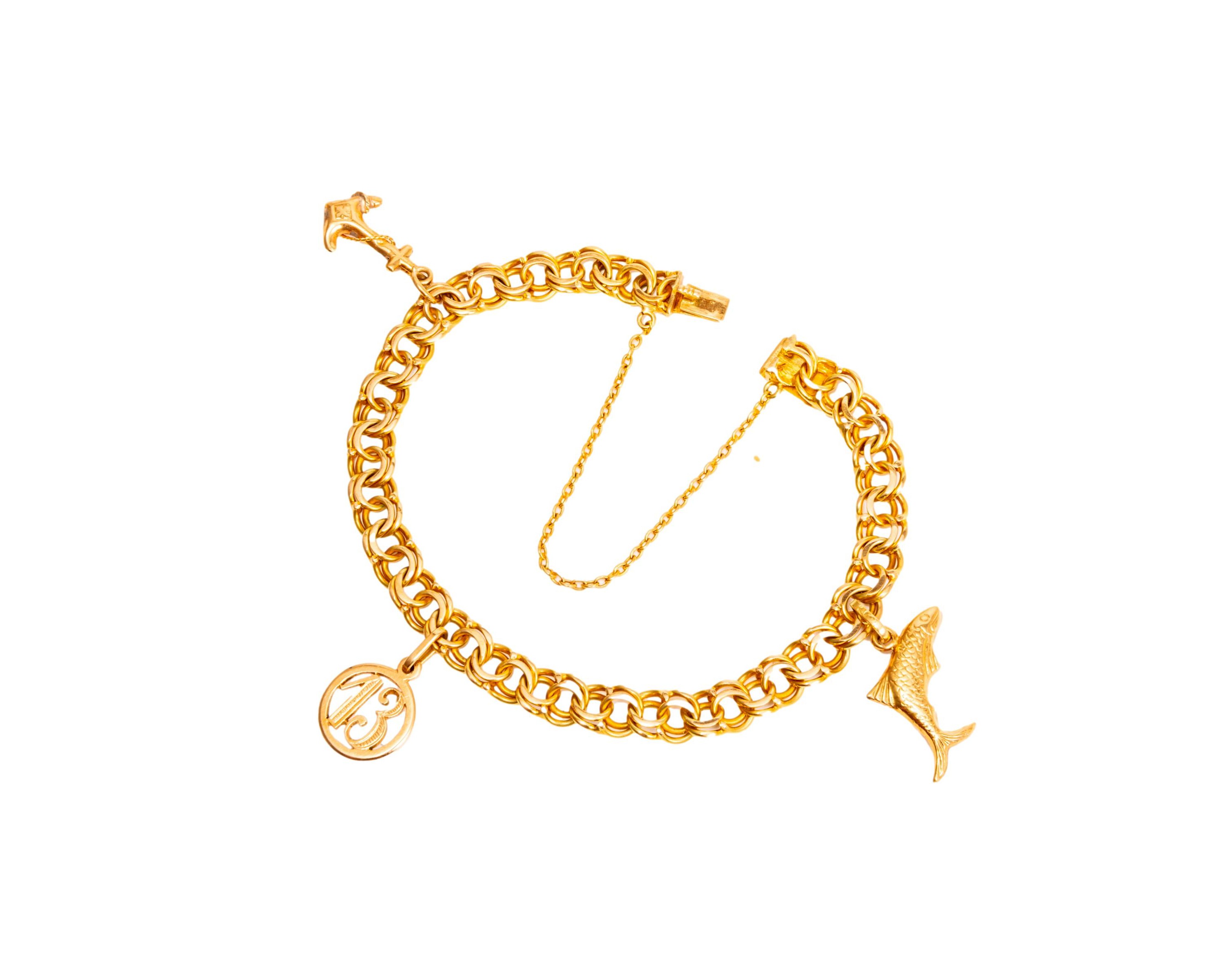 Złota bransoletka z trzema przywieszkami (charmsami) - liczby 13, kotwicy i ryby. Bransoletka wykonana z żółtego złota próby 585, na długość ok. 18 cm. Zapięcie to klasyczna szufladka z łańcuszkiem zabezpieczającym przed przypadkowym odpięciem, długość łańcuszka to ok. 8 cm.