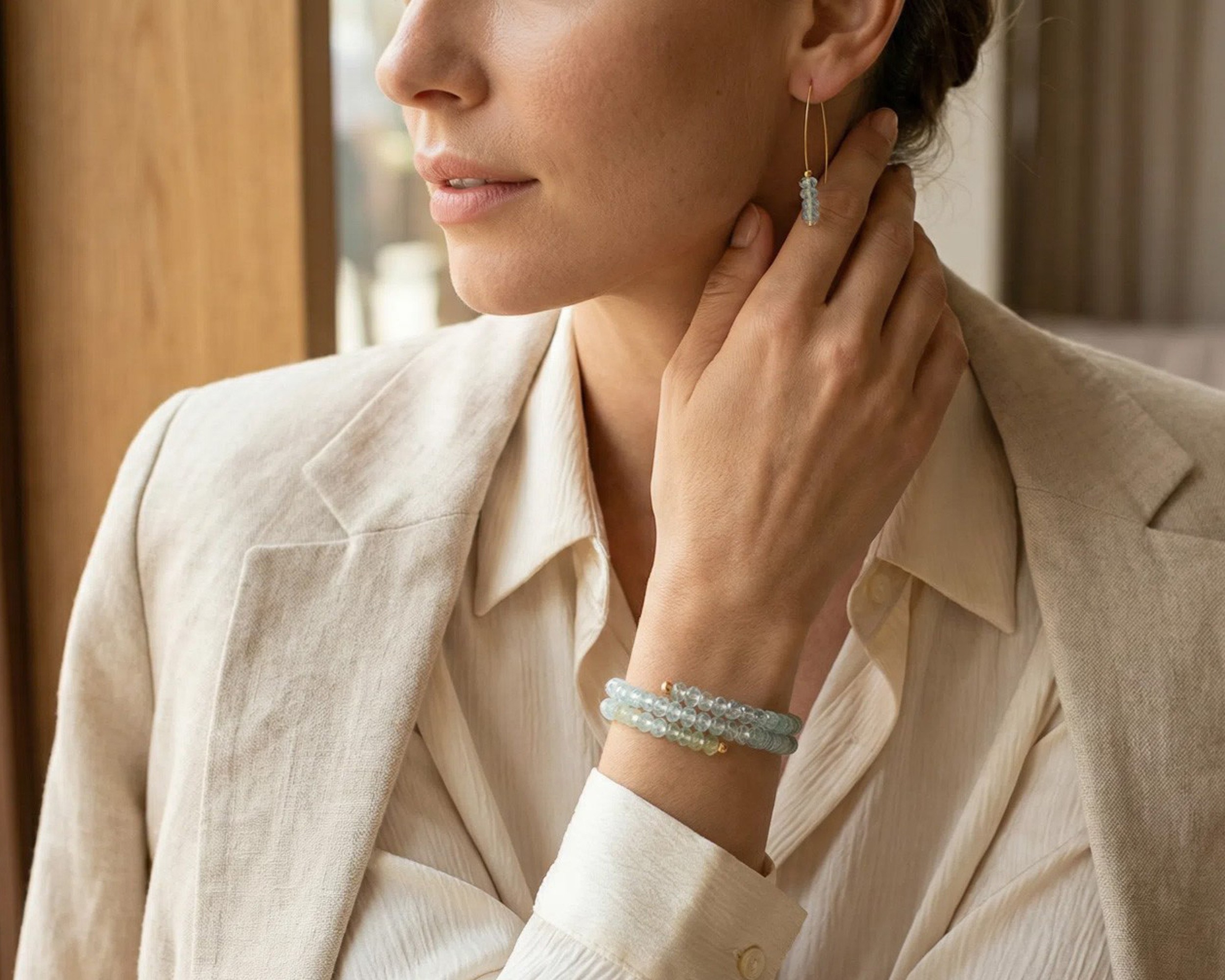 Fasetowane akwamaryny – oszlifowane w sposób podkreślający ich naturalny, wodny blask – tworzą harmonijną linię koloru przypominającego kryształowo czyste morskie fale. Ich jasny, niebieskawo-zielony odcień pięknie kontrastuje z ciepłym żółtym złotem zakończeń. Akwamaryn to kamień o głębokiej symbolice – tradycyjnie kojarzony ze spokojem, jasnością umysłu i ochroną podczas podróży, szczególnie morskich.