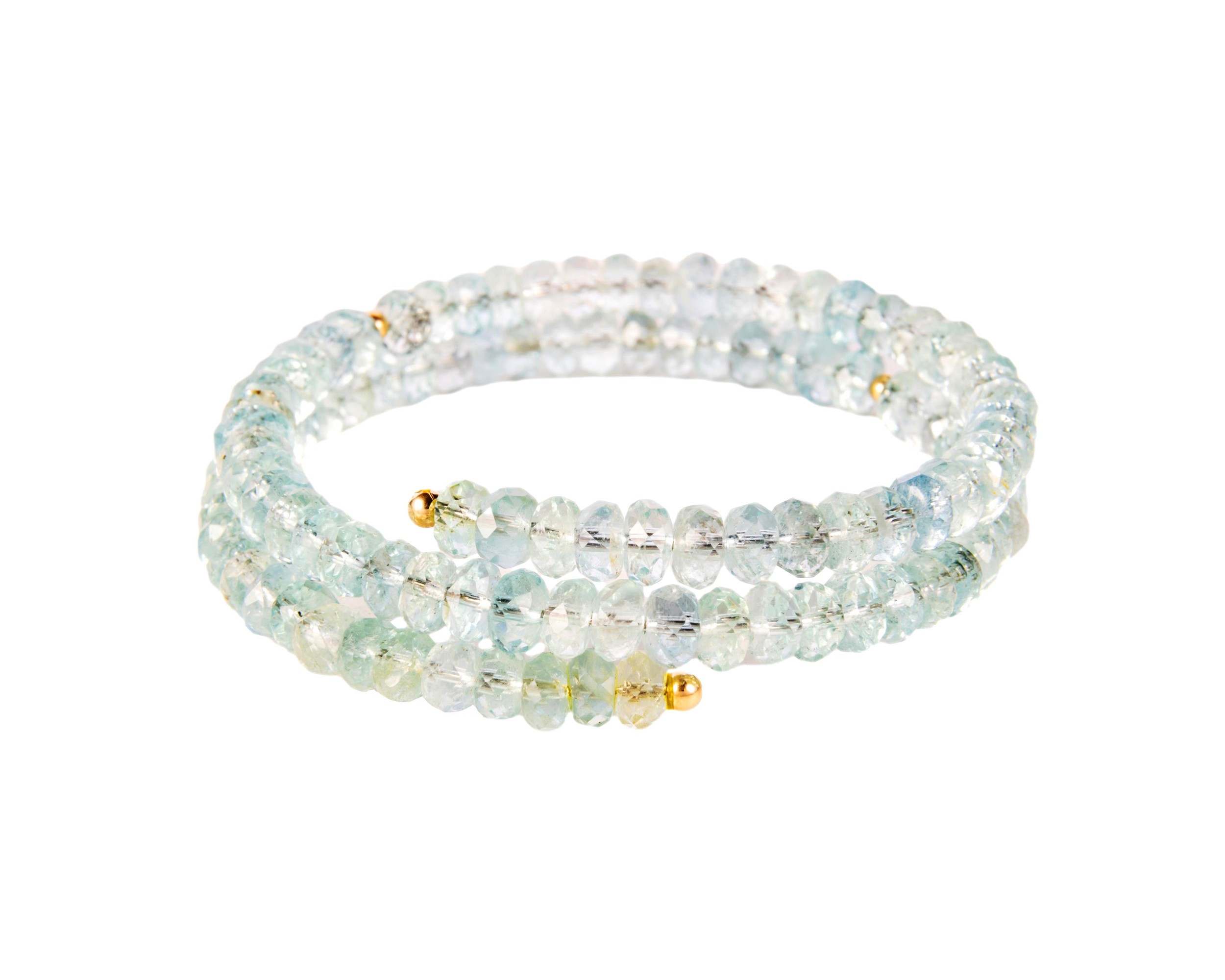 Złota bransoletka zawijana wokół nadgarstka ze złotymi zakończeniami, z fasetowanymi akwamarynami.
