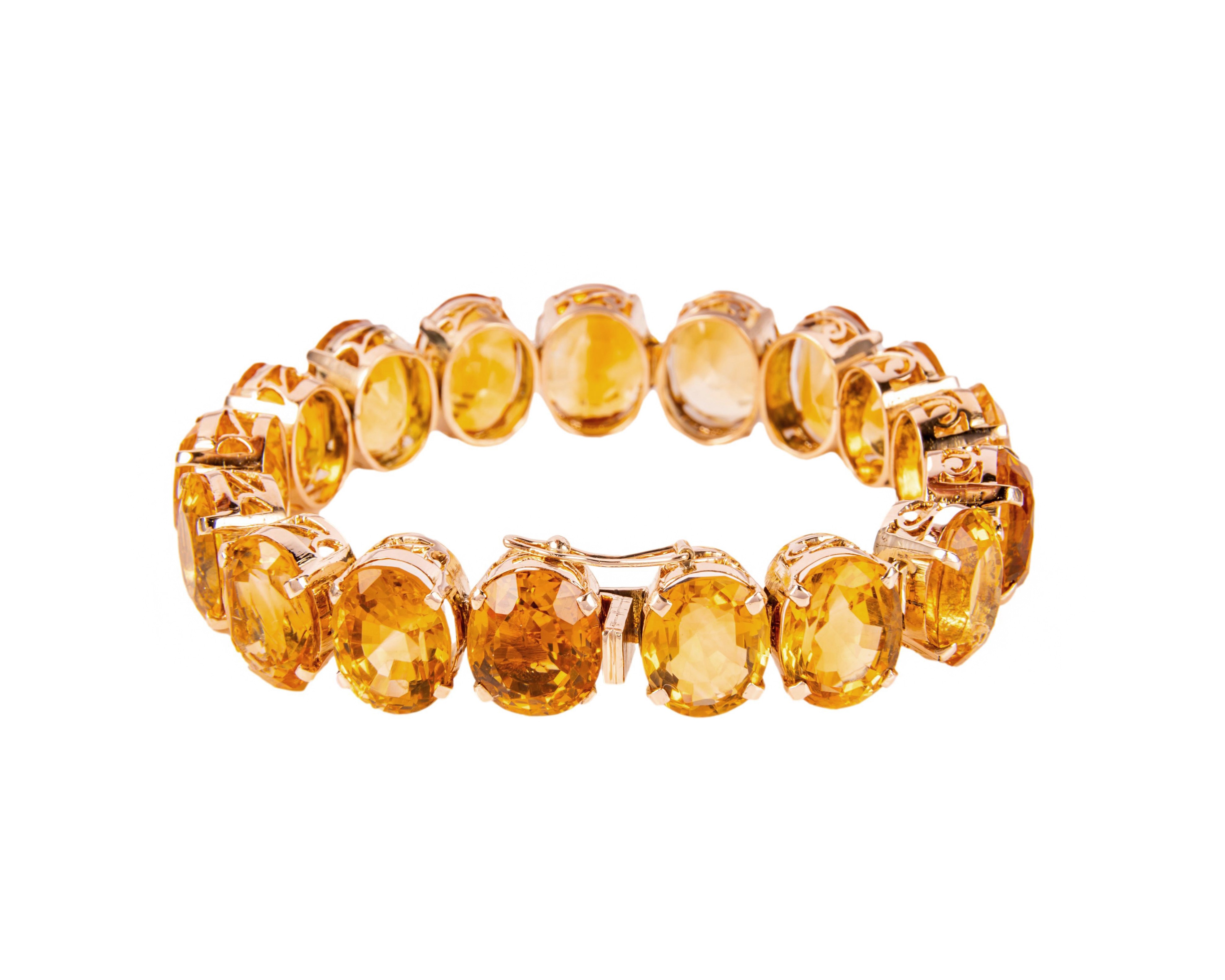 Złota bransoletka wysadzana cytrynami na całej swojej długości (17 cm). Kamienie są fasetowane, niektóre w bardziej okrągłym lub owalnym kształcie. Z klasycznym zapięciem typu szufladka, z boczną ósemką zabezpieczającą przed przypadkowym odpięciem się bransoletki. Całość wykonana w żółtym złocie próby 585.