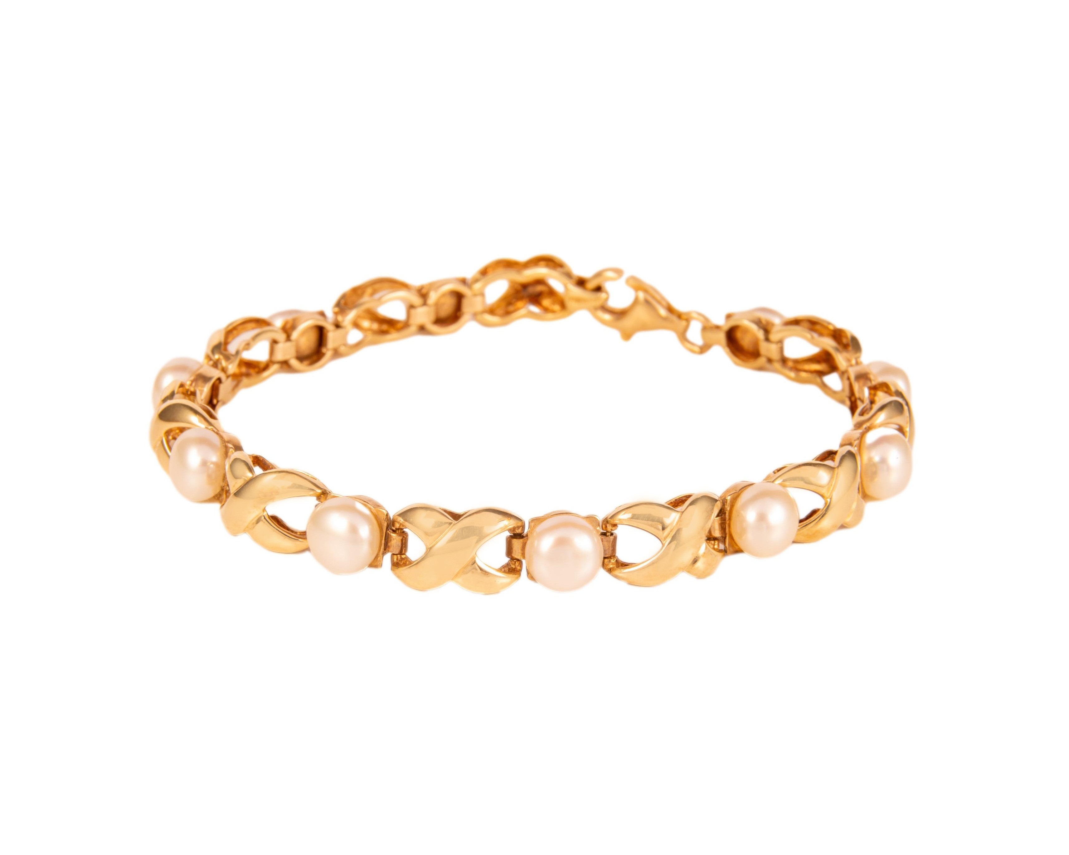 Złota bransoletka z perłami słodkowodnymi, wykonana z żółtego złota 14 karatowego, na długość 18,5 cm.