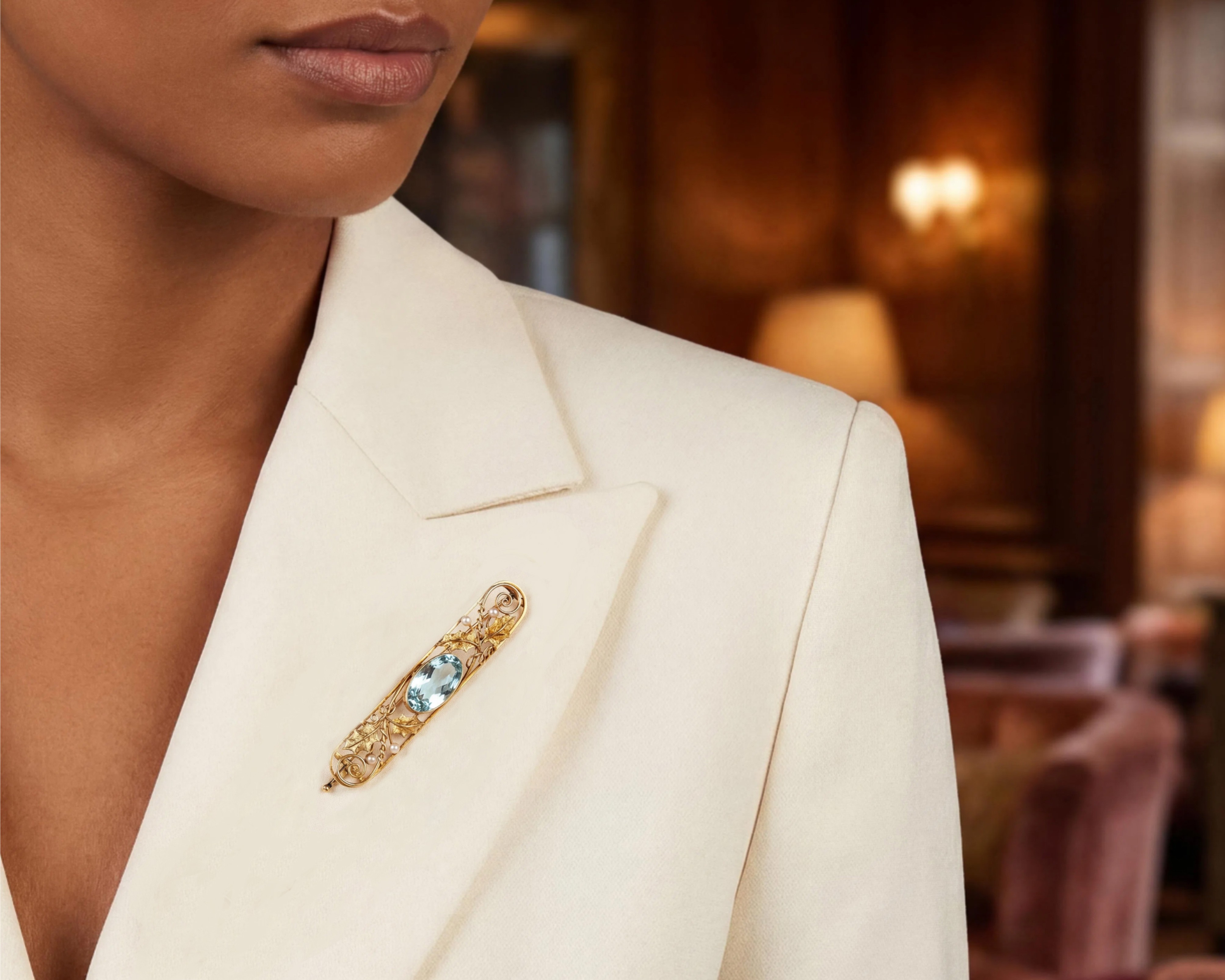 Złota broszka z akwamarynem 5,13 ct i perłami – Art Nouveau w czystej postaci
