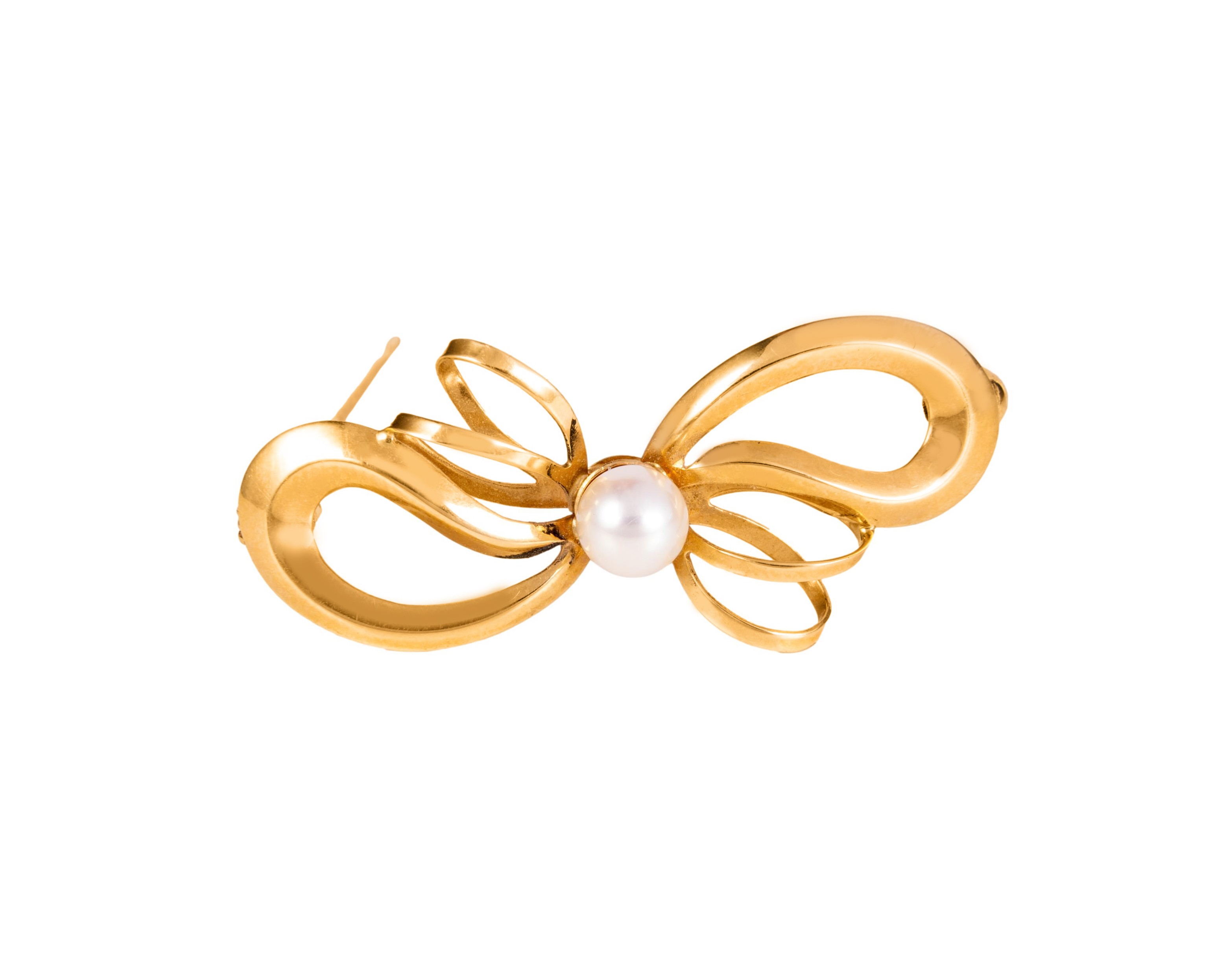 Złota broszka o ciekawej formie z centralnie umieszczoną perłą słodkowodną, całość ma długość ok. 4 cm. Wyrób posiada świadectwo badania z Urzędu Probierczego, z którego wynika, że broszkę wykonano ze złota próby 585.