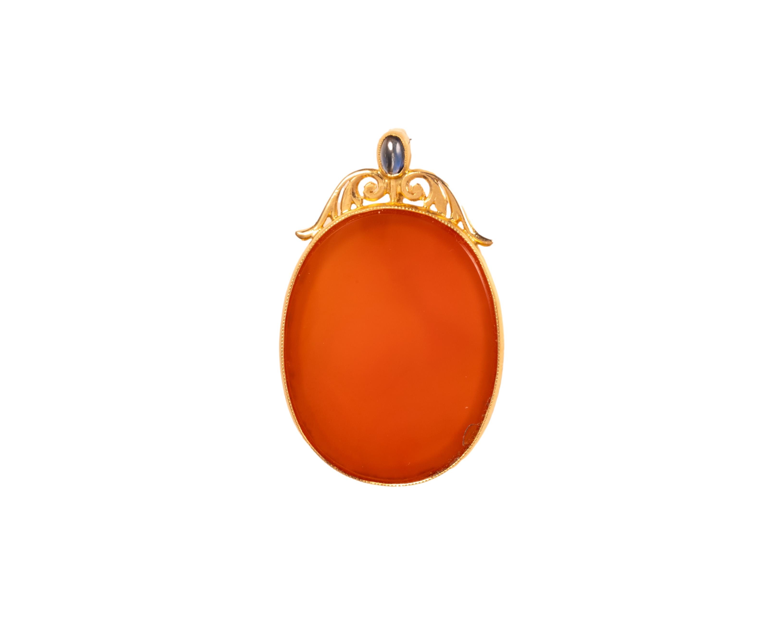 Owalna zawieszka z dekoracyjnym motywem w swojej górnej części. Głównym kamieniem jest oszlifowany na płasko karneol, mniejszym kamieniem wkomponowanym w ornament to niebieski korund - zasłaniający ogniwo od zawieszki. Wymiary zawieszki to ok. 3,5 na 2 cm, całość wykonana w żółtym złocie próby 3, tj. 585.