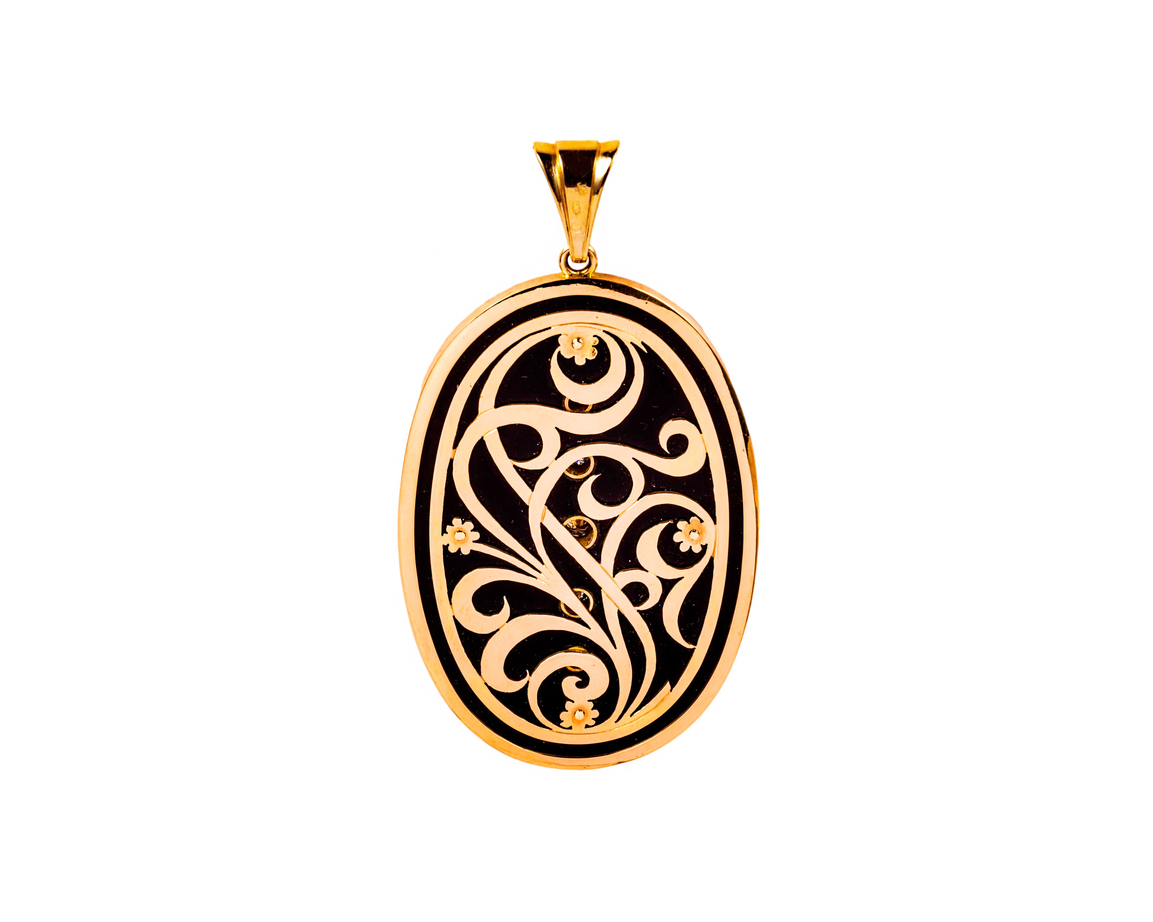 Wyjątkowa, elegancka zawieszka, która łączy w sobie: czerń onyksu, blask diamentów ze złotą oprawą. Na froncie rozmieszczono w symetrycznym wzorze 56 diamentów o łącznej masie ok. 2 karatów, czystości VS oraz barwie w przedziale od G do H. Tył zawieszki ma dekoracyjny motyw roślinny wykonany ze złotej oprawy z prześwitami - ukazującymi tył onyksu. Całość ma wymiary ok. 8 na 4,5 cm, zawieszka wykonana z żółtego złota próby 3, tj. 585.