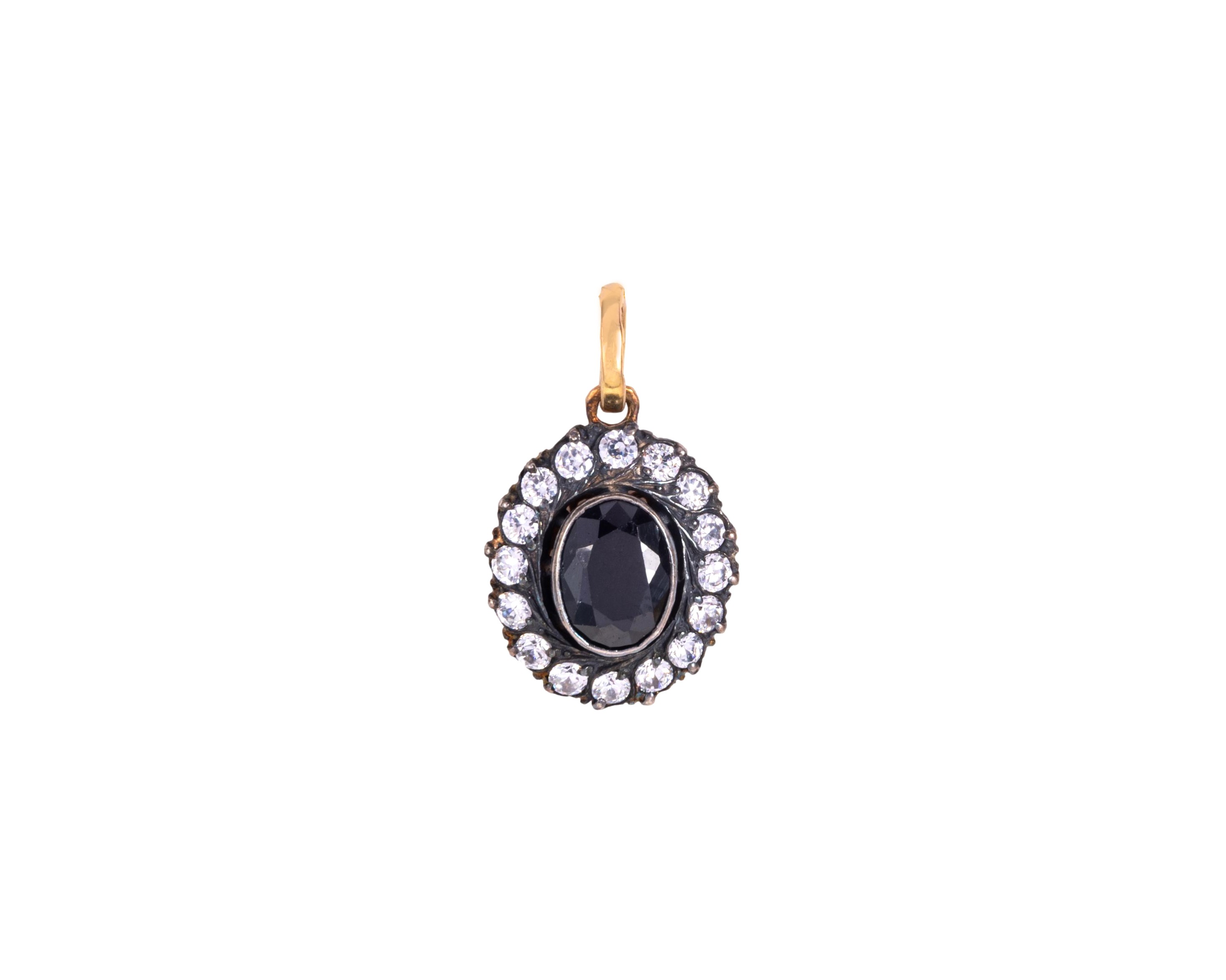 Złota zawieszka, wielkości ok. 2 cm, wykonana ze złota próby 3, tj. 585. Z centralnie oprawionym szafirem o wymiarach ok. 6,8x5,5 mm i bocznymi cyrkoniami.