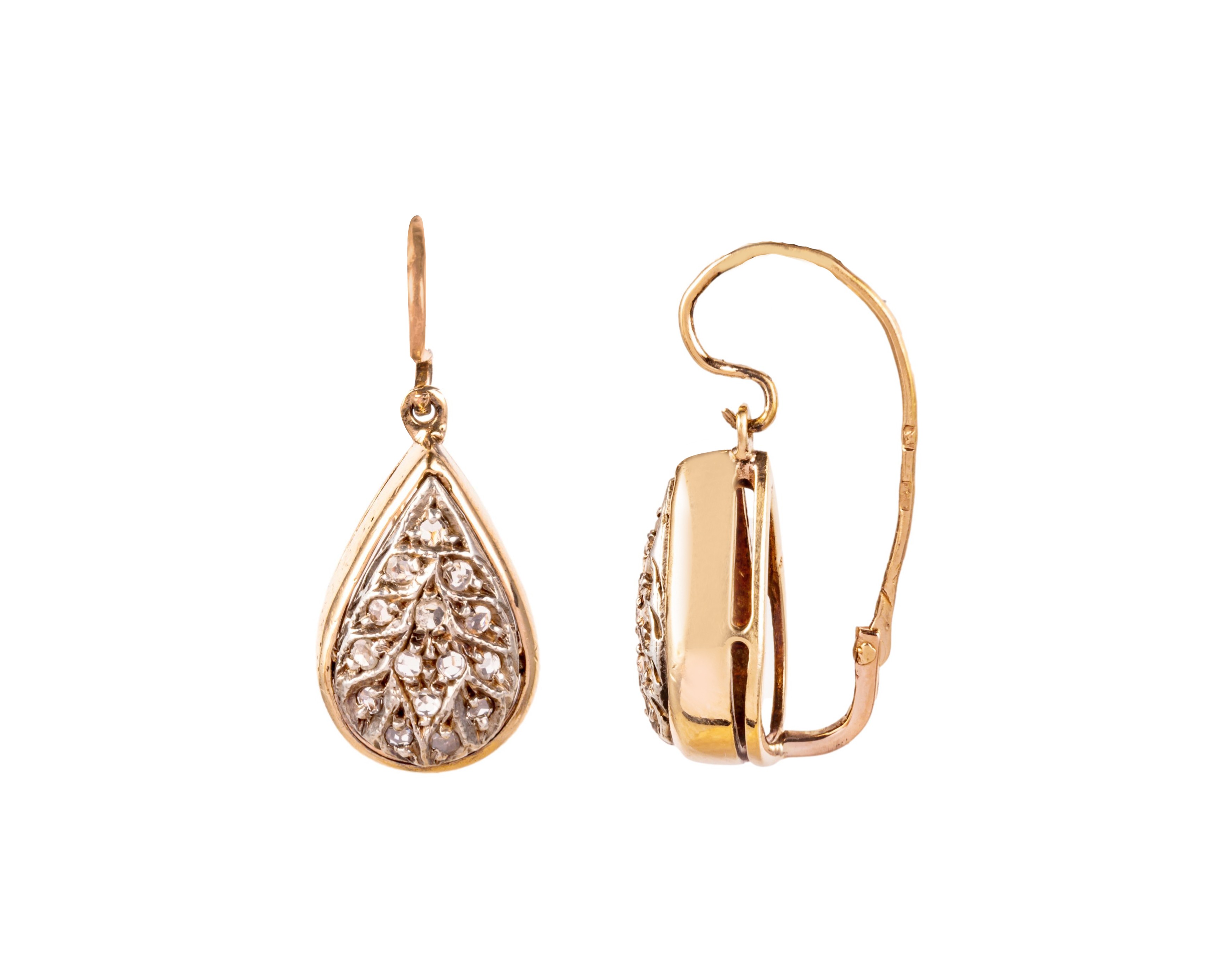 Para wiszących kolczyków wykonanych w złocie z diamentowymi rozetami. Długość kolczyka to ok. 2,8 cm.