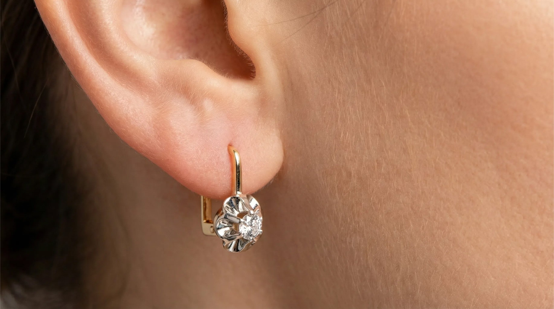 Para złotych kolczyków z diamentami, których łączna masa wynosi ok. 0,50 krata. Czystość kamieni to VS-Si1, a ich barwa G. Długość kolczyka to ok. 1,7 cm. Całość wykonana ze złota próby 3, tj. 585.