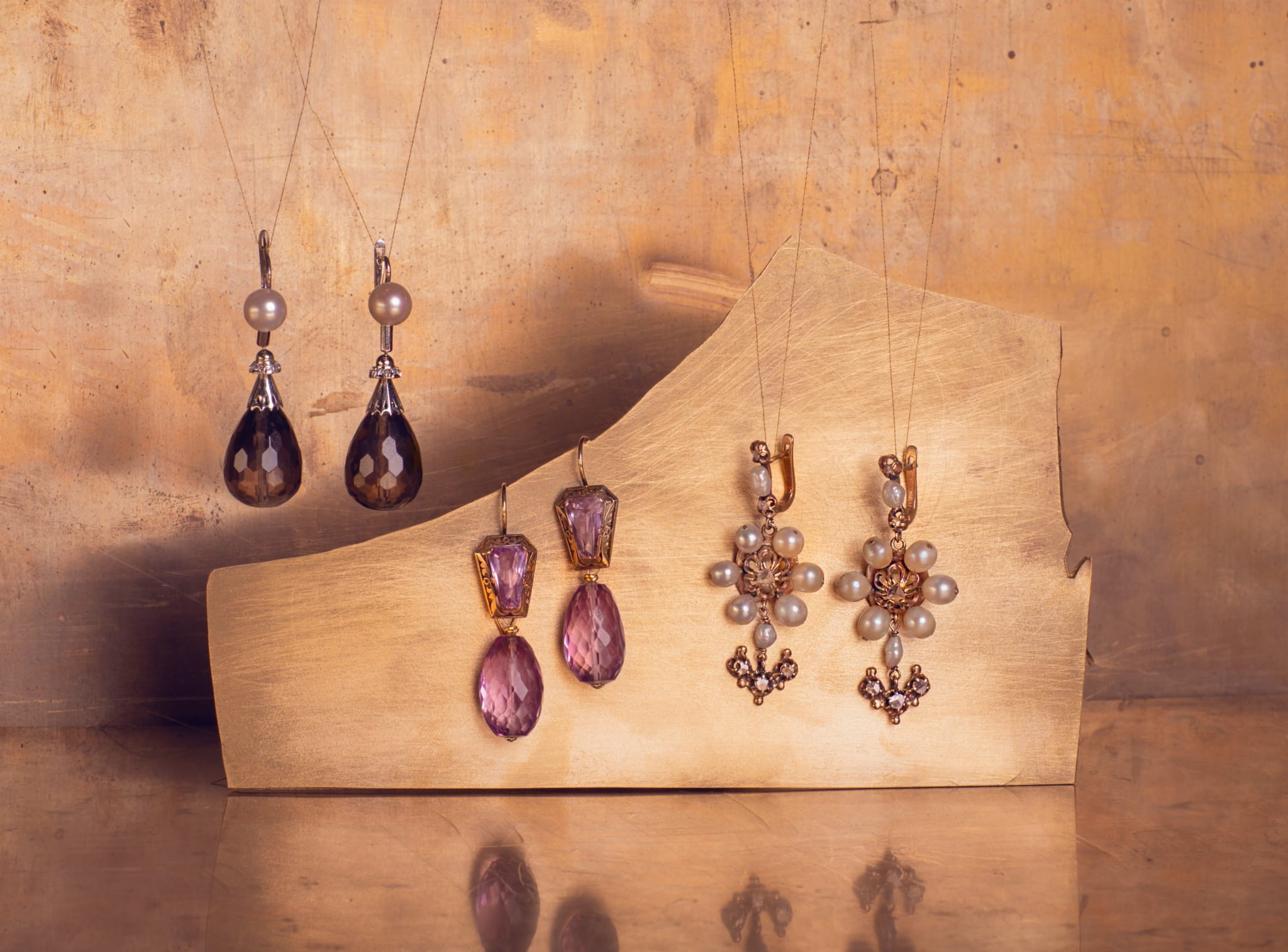 Złote kolczyki z perłami, diamentami i kwarcami dymnymi