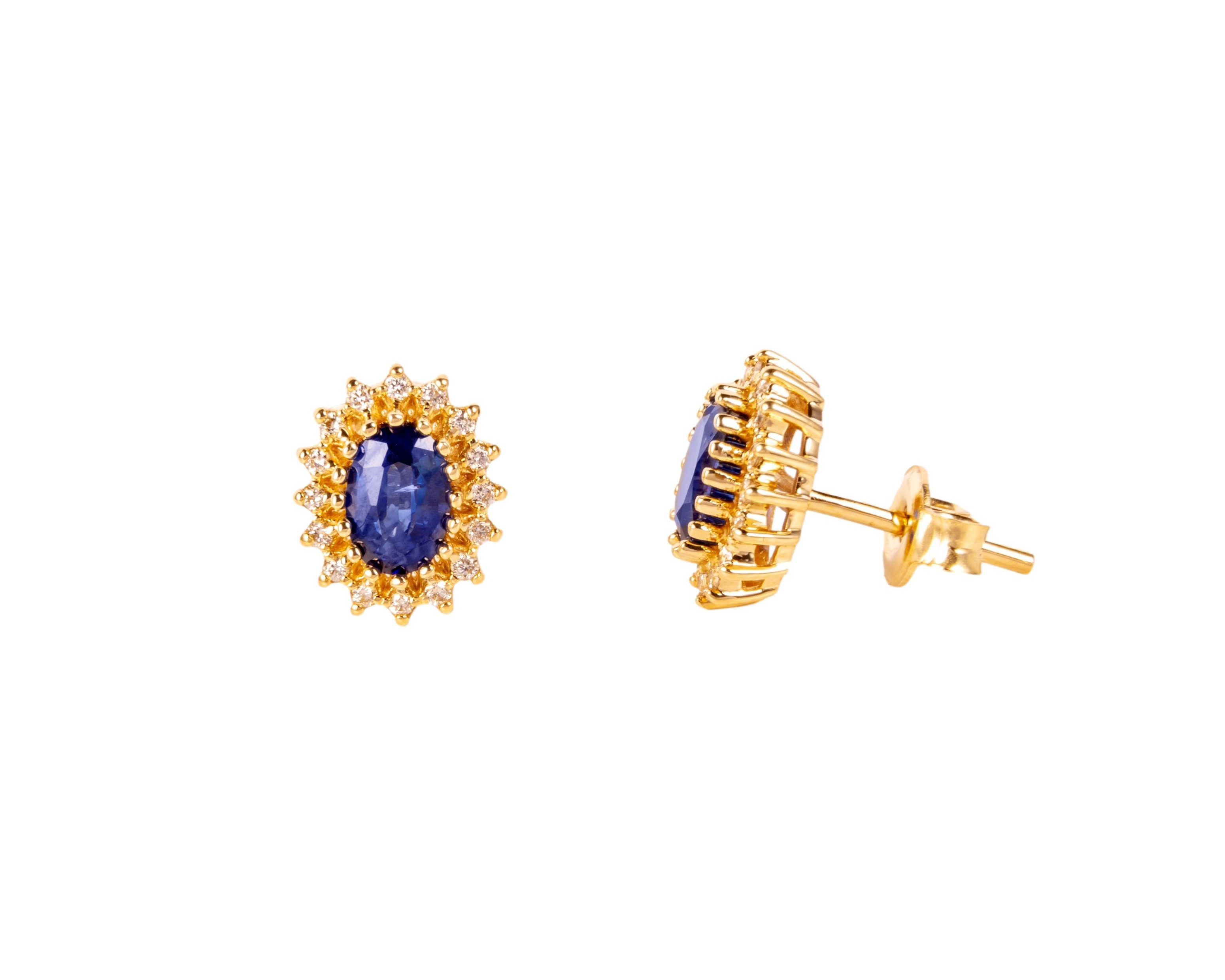 Para złotych kolczyków z szafirami o łącznej masie ok. 1,20 karata i diamentami o łącznej masie ok. 0,16 karata, czystości VS oraz barwie E-F. Wielkość kolczyka to ok. 1 cm. Całość wykonana w żółtym złocie próby 3, tj. 585.