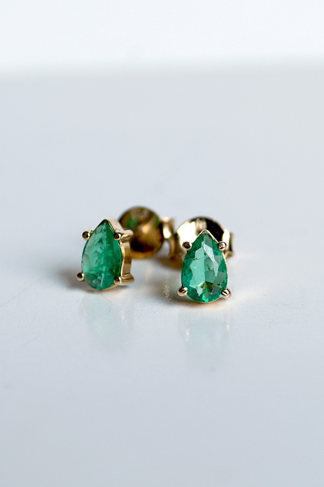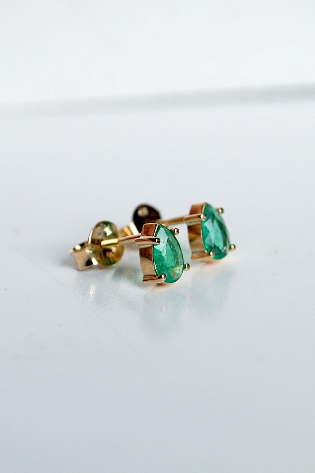 Para złotych kolczyków na sztyfcie ze szmaragdami z Etiopii. Szmaragdy mają ok. 0,22 karata i ok. 0,24 karata, kształt łezki (gruszki). Całość wykonana w żółtym złocie wysokiej próby 750.