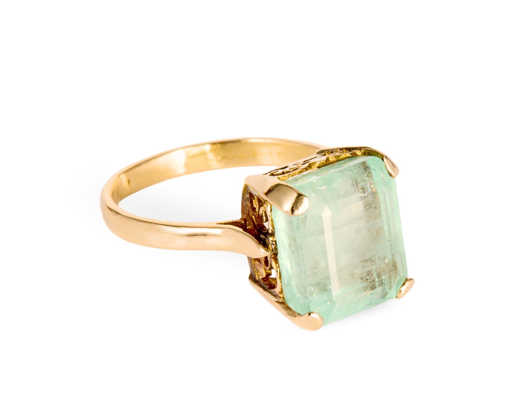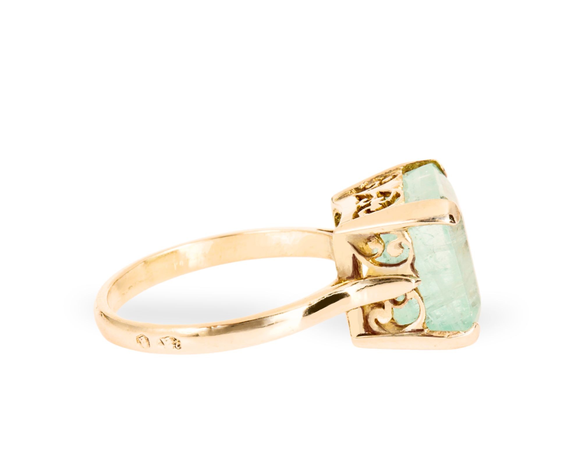 Pierścionek ze zdobionymi bokami oprawy szmaragdu. Centralnie osadzony w czterech łapkach szmaragd ma masę przybliżoną 6,5 karata. Całość wykonana w żółtym złocie wysokiej próby 2, tj. 750, na rozmiar 19.