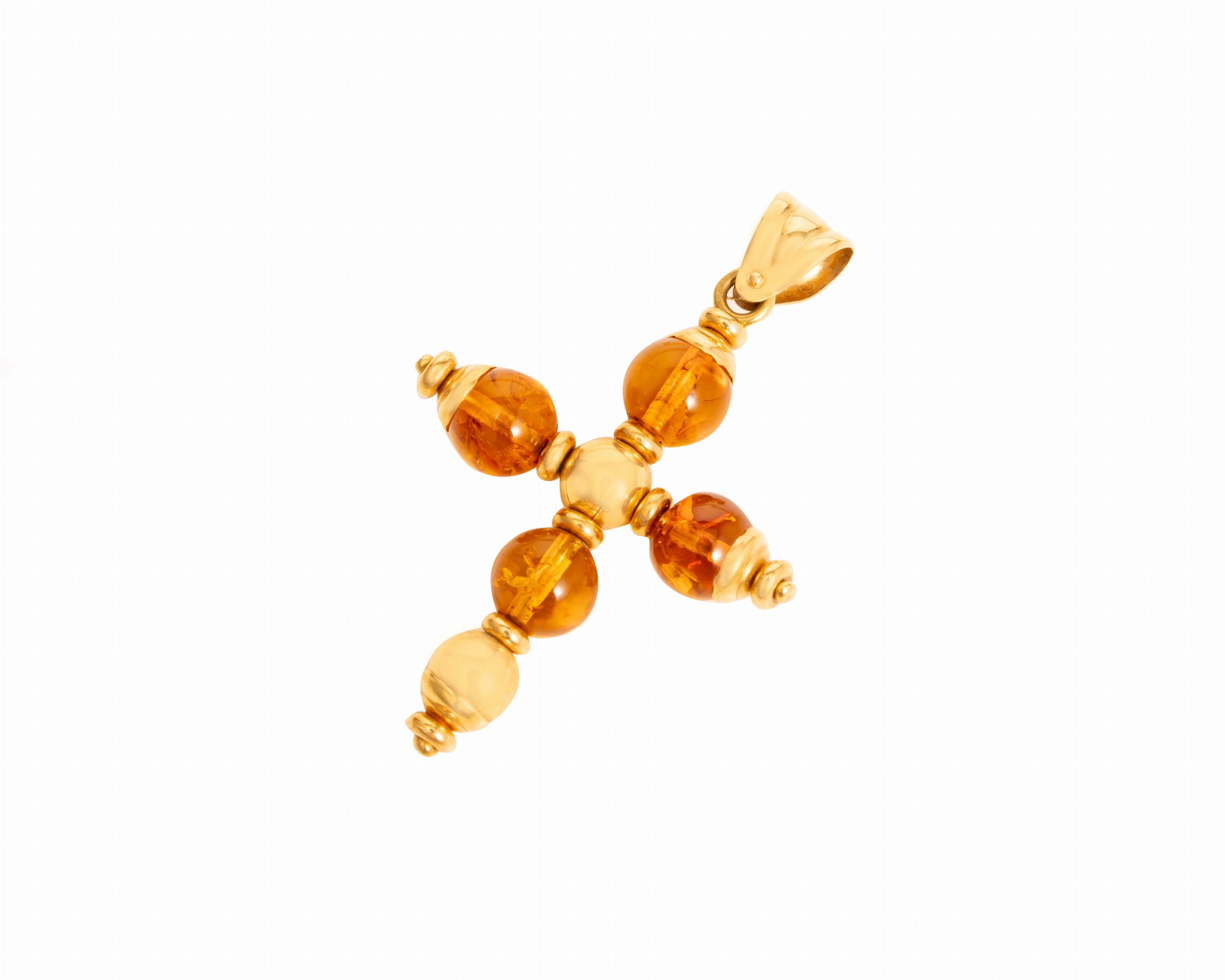 Złota zawieszka - krzyżyk z 4 bursztynami, całość wykonana w złocie wyższej próby 750, tj. 18 karatów.