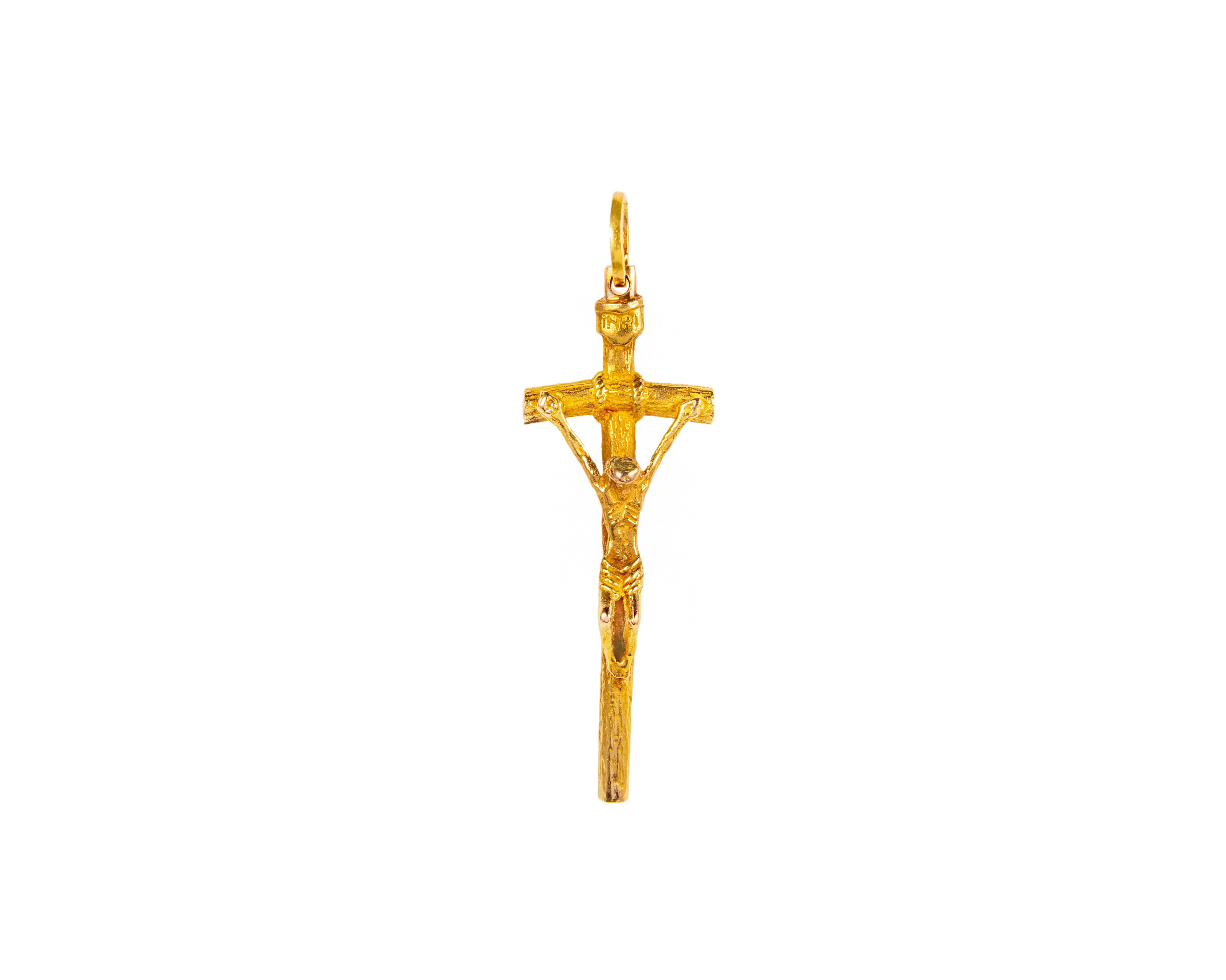 Krzyżyk wielkości 5,3 na 1,8 cm, wykonany z żółtego złota.