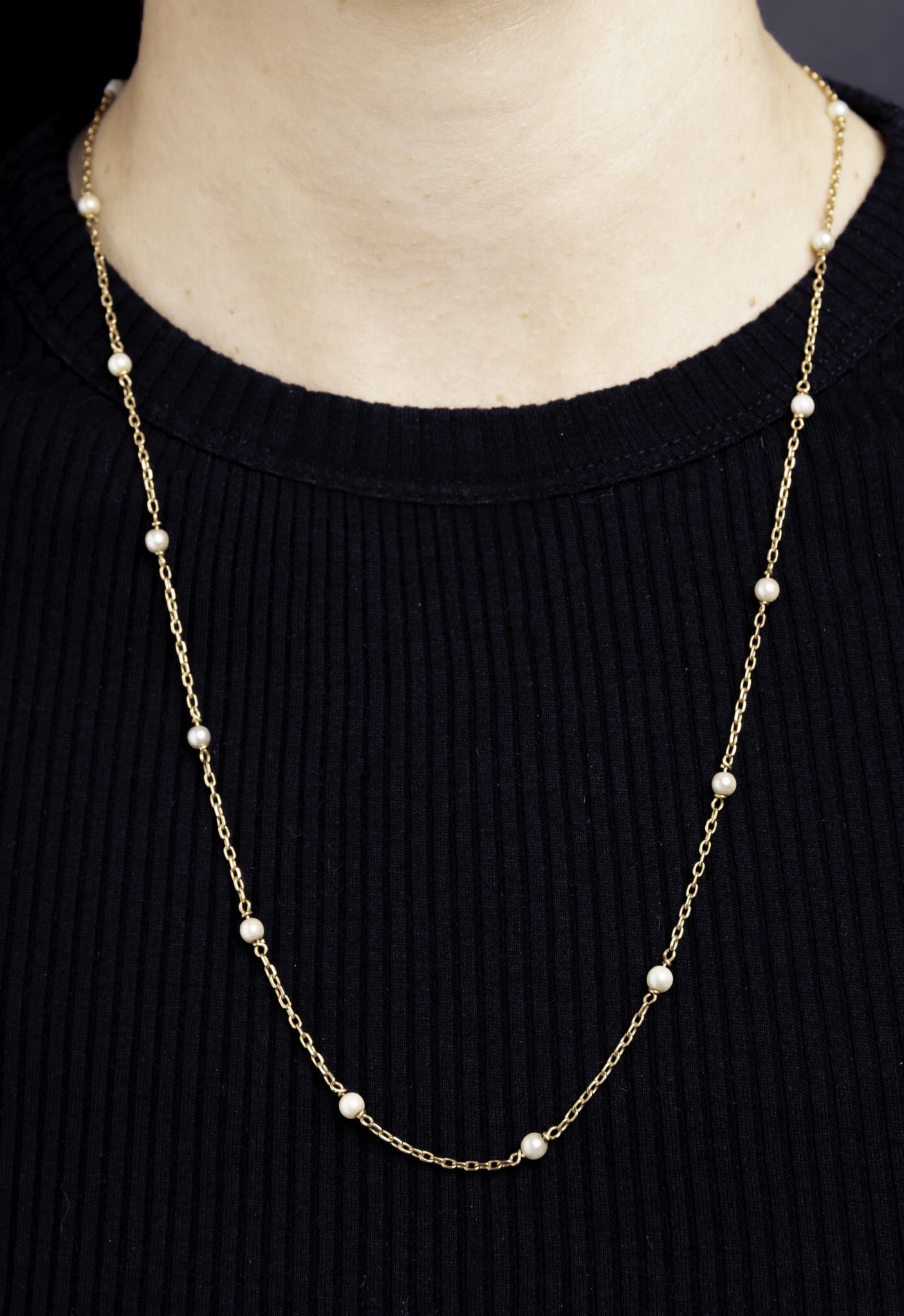 Subtelny złoty naszyjnik z symetrycznie rozstawionymi perełkami o długości 60 cm.