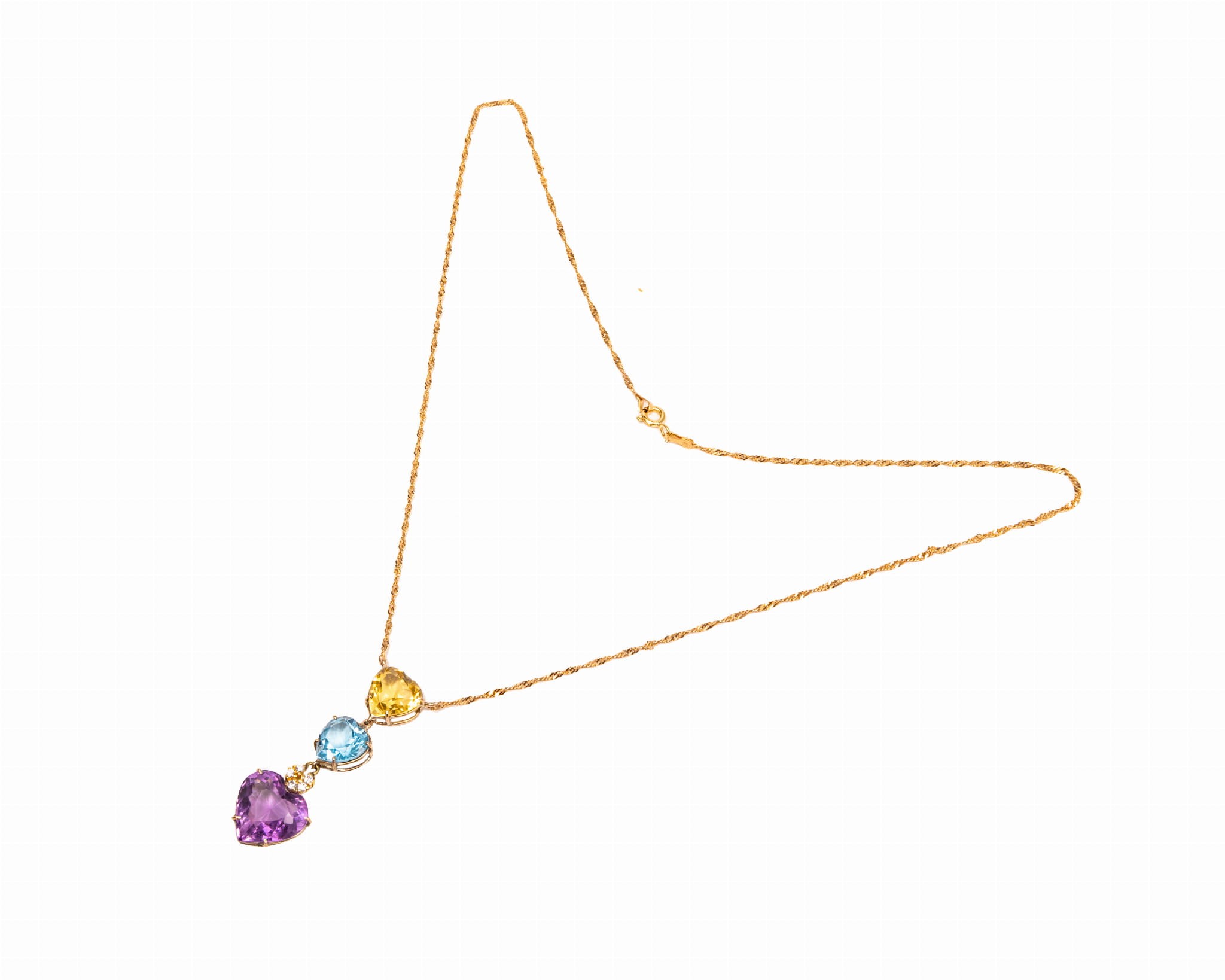 Złoty naszyjnik z łańcuszkiem o splocie typu singapur z podłużną zawieszką z 5 diamentami, ametystem, topazem oraz cytrynem. Całość wykonana w żółtym złocie z mieszanej próby złota od 460 do 750 - według świadectwie badania wystawionego przez Urząd Probierczego.