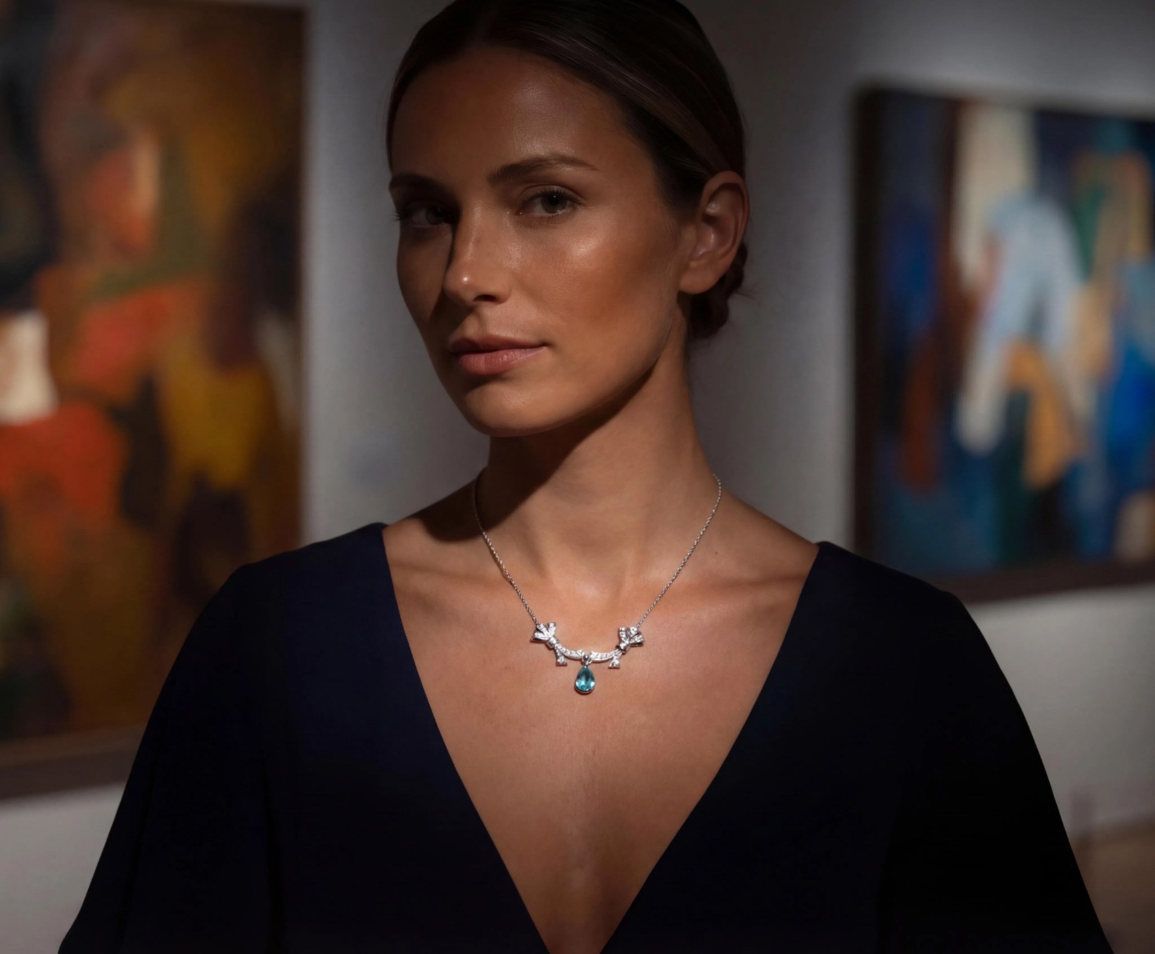 Forma kokardki z diamentami i wiszącym kamieniem to klasyczny motyw Art Deco – stylu, który rozkwitł w latach 20. i 30. XX wieku i słynął z geometrycznych form, symetrii, luksusu i połączenia różnych kamieni szlachetnych. To estetyka Wielkiego Gatsby'ego, pereł i champagne, eleganckich przyjęć i wyrafinowania.