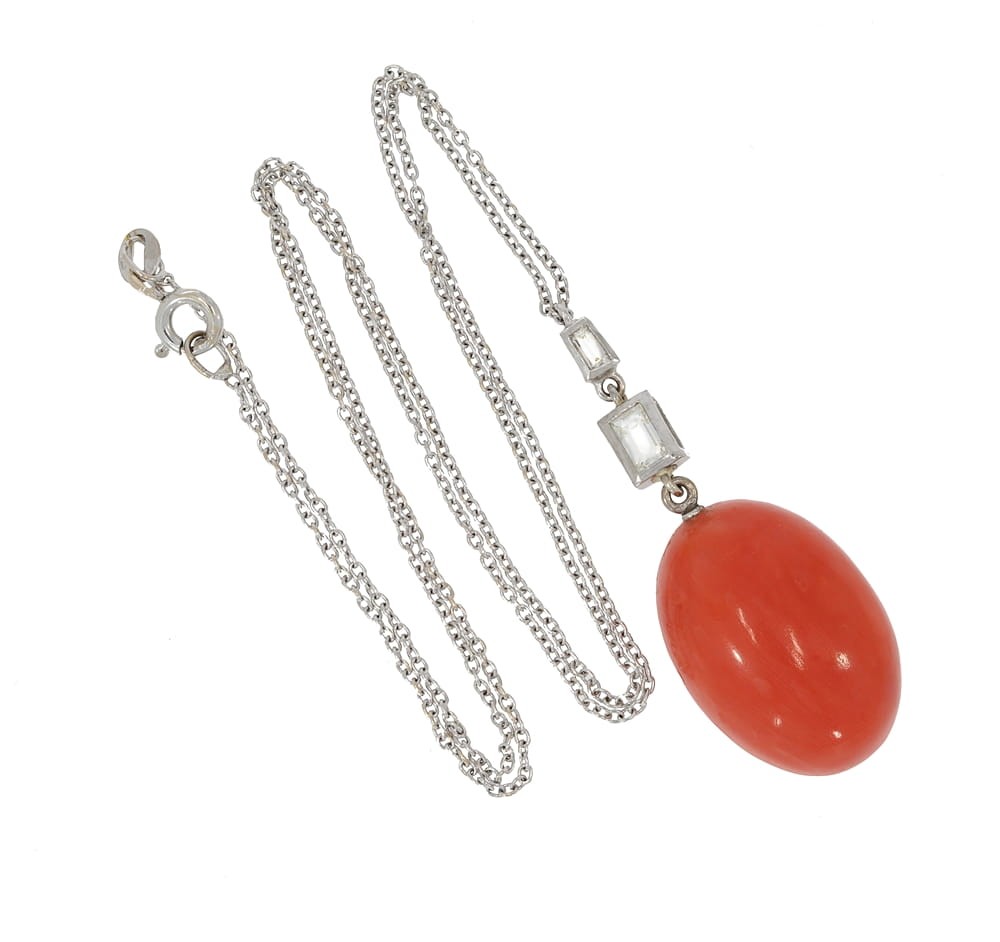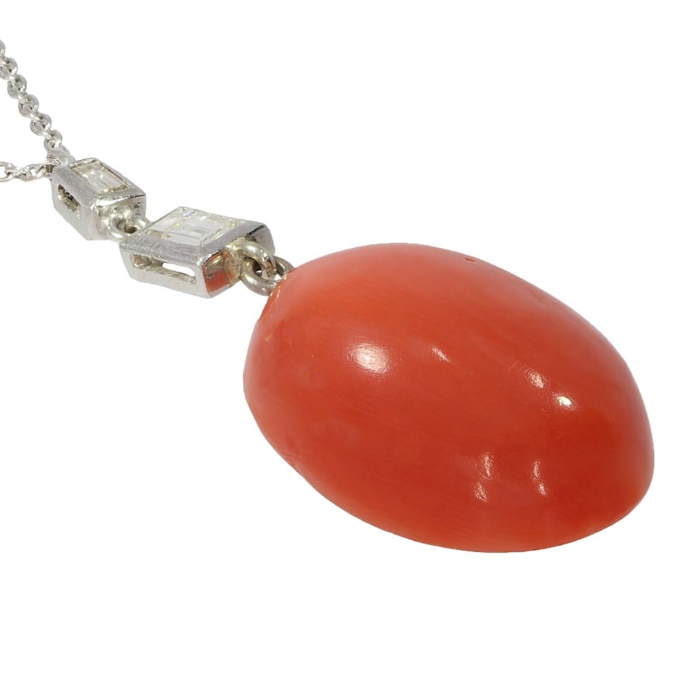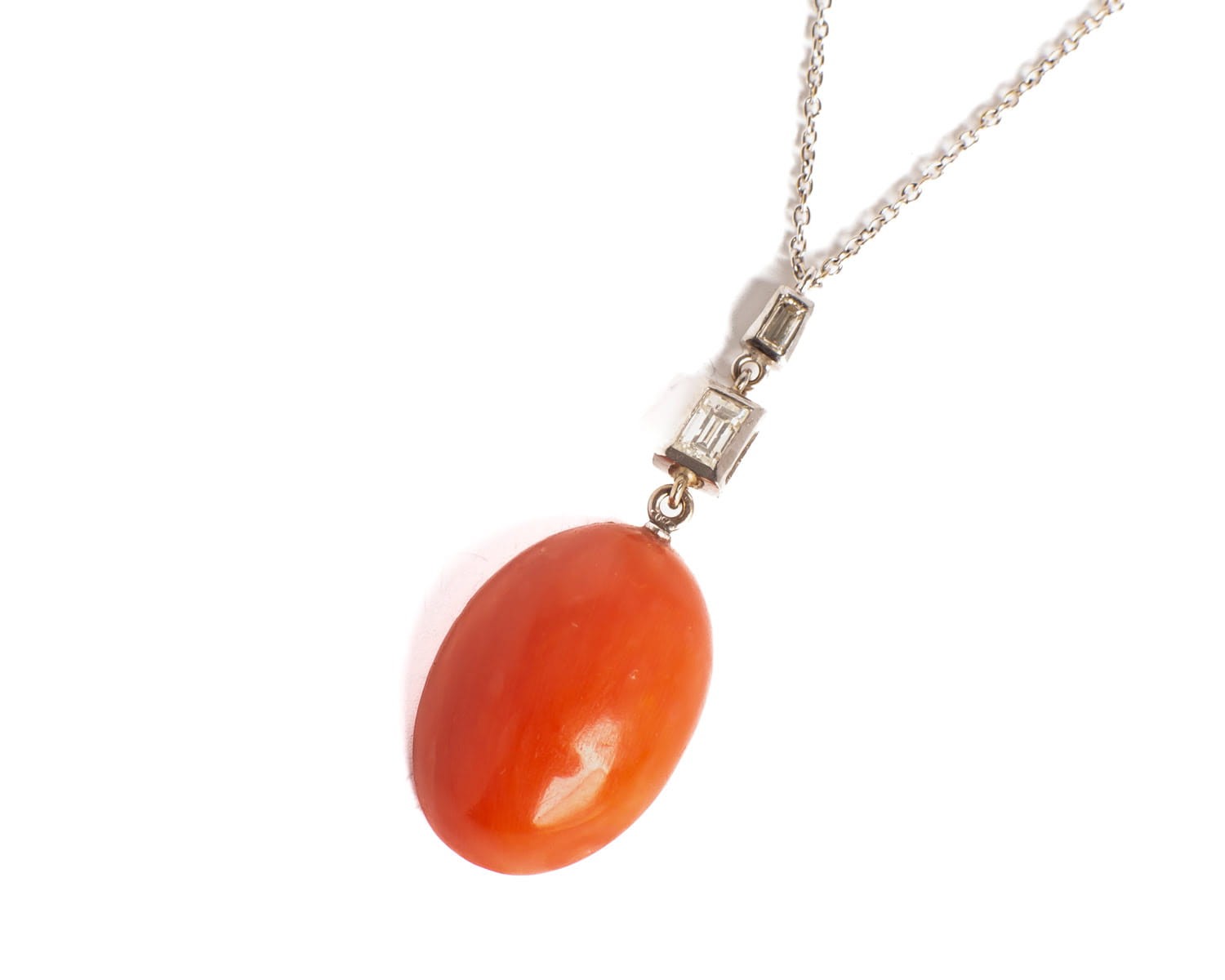 Delikatny naszyjnik z koralem i dwoma prostokątnymi diamentami w szlifie szmaragdowym wykonany ze złota. Kamienie pięknie lśnią w blasku światła i przyciągają wzrok. Elegancki i bardzo kobiecy, będzie doskonałym uzupełnieniem wielu stylizacji. Idealny pomysł na piękny prezent z wielu okazji.