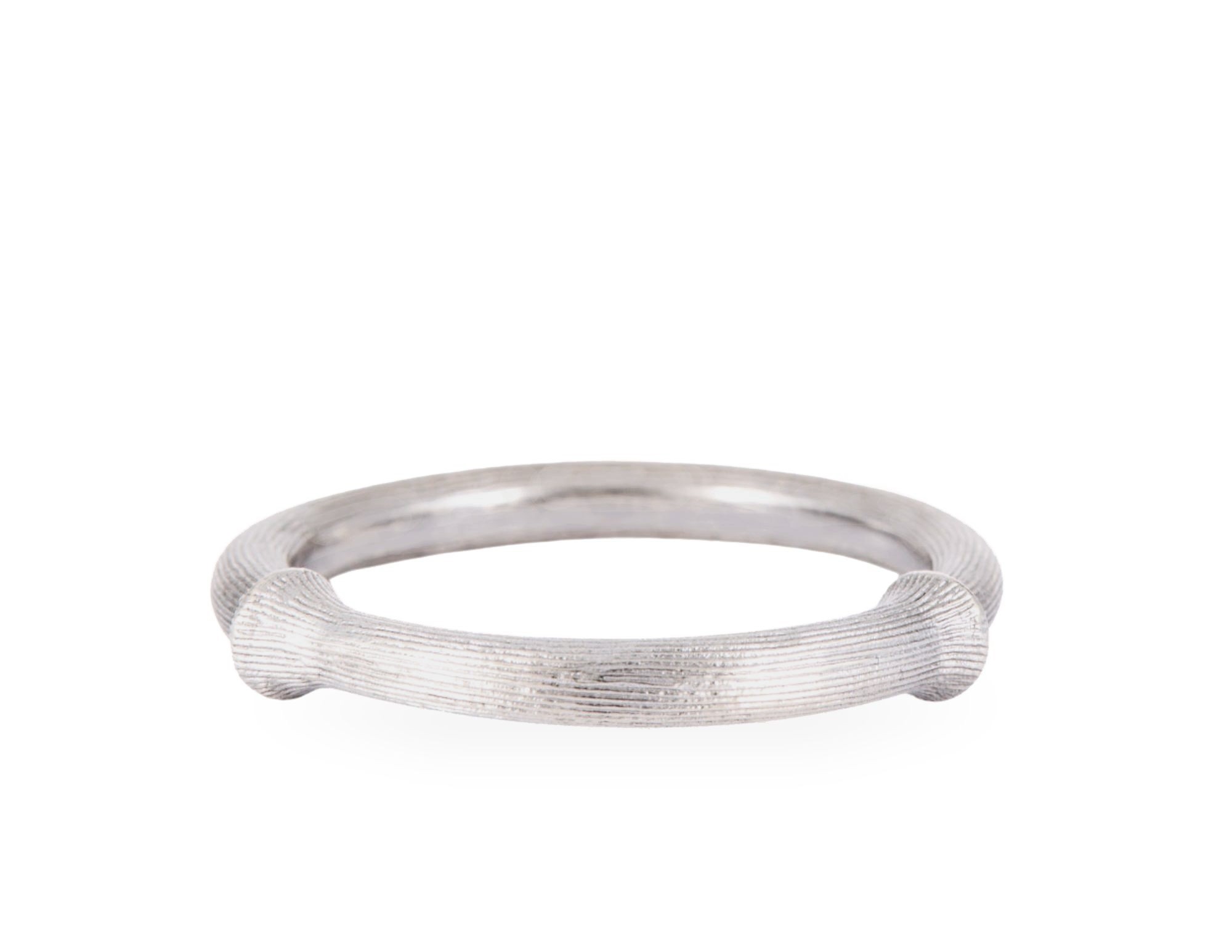 Pierścionek ma formę szerokiej, zaokrąglonej obrączki z charakterystycznym, lekko organicznym profilem – przekrój nie jest idealnie okrągły, z delikatnymi zgrubieniami po bokach przypominającymi węzły na gałęzi lub korzeniu. Cała zewnętrzna powierzchnia pokryta jest gęstym, ręcznie wykonanym grawerunkiem równoległych linii biegnących wzdłuż obwodu obrączki – efekt przypomina słoje drewna, żyłki liścia lub fale piasku. To faktura, która zmienia się w zależności od kąta padania światła: przy ostrym świetle metalicznie iskrzy, w rozproszonym – sprawia wrażenie miękkiego, matowego jedwabiu. Wewnętrzna część obrączki jest gładka i polerowana z grawerem "Ole L 750".