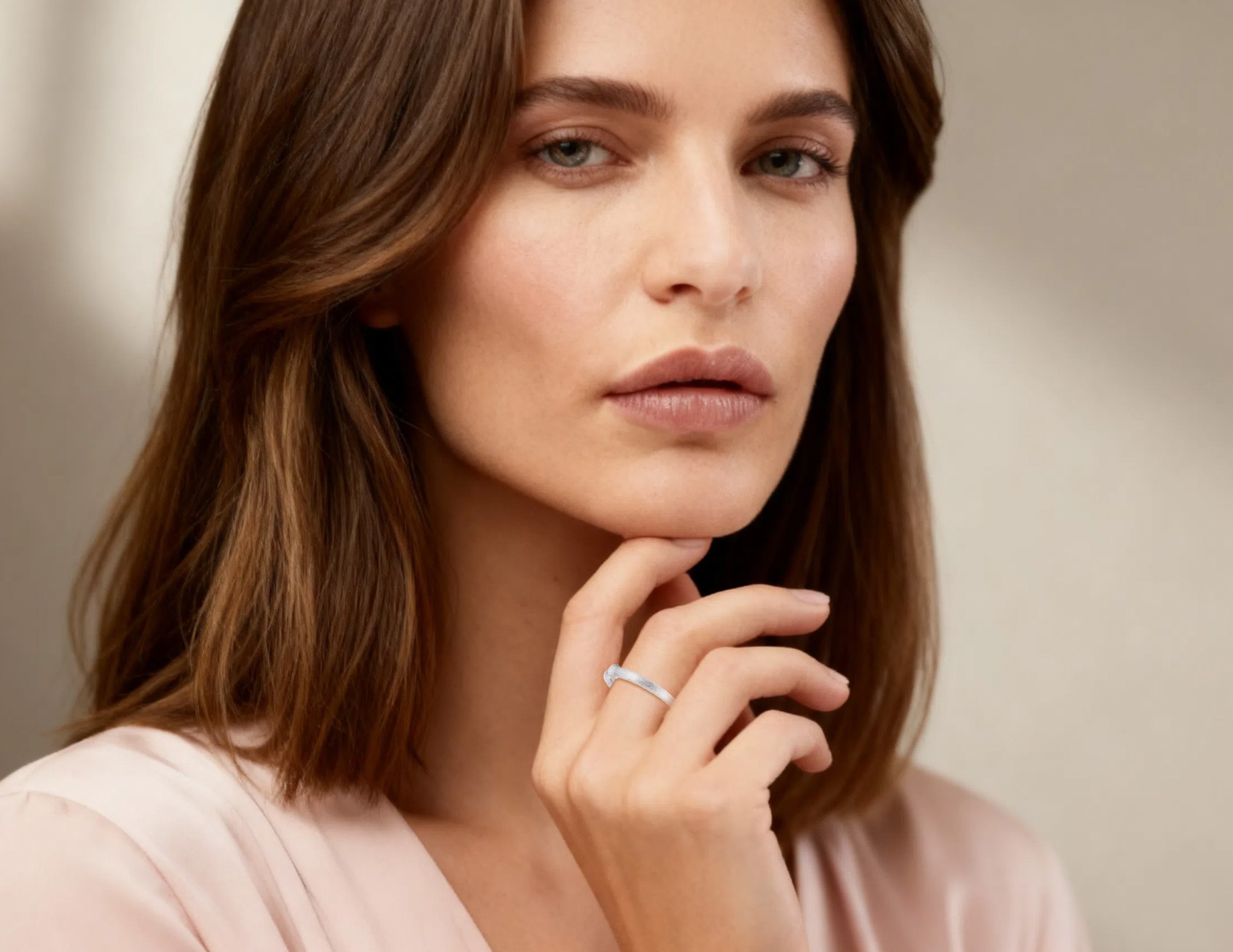 Obrączka z kolekcji Nature III to propozycja dla osób, które szukają biżuterii minimalistycznej w formie, ale bogatej w detal. Bez kamieni, bez skomplikowanej kompozycji – sam metal i jego faktura. Sprawdzi się jako elegancka obrączka ślubna dla par ceniących design i autorskie złotnictwo, a także jako codzienna ozdoba dla miłośniczek skandynawskiej estetyki. Można ją nosić samodzielnie lub łączyć z innymi pierścionkami z kolekcji Nature – marka projektuje je z myślą o stackingu, czyli noszeniu kilku elementów biżuterii jednocześnie, tworząc spersonalizowane zestawy.