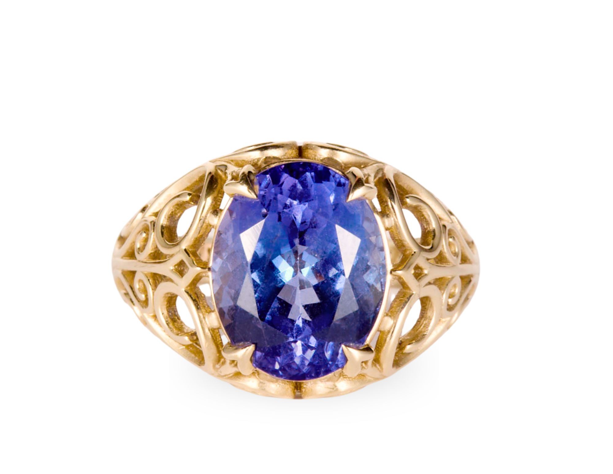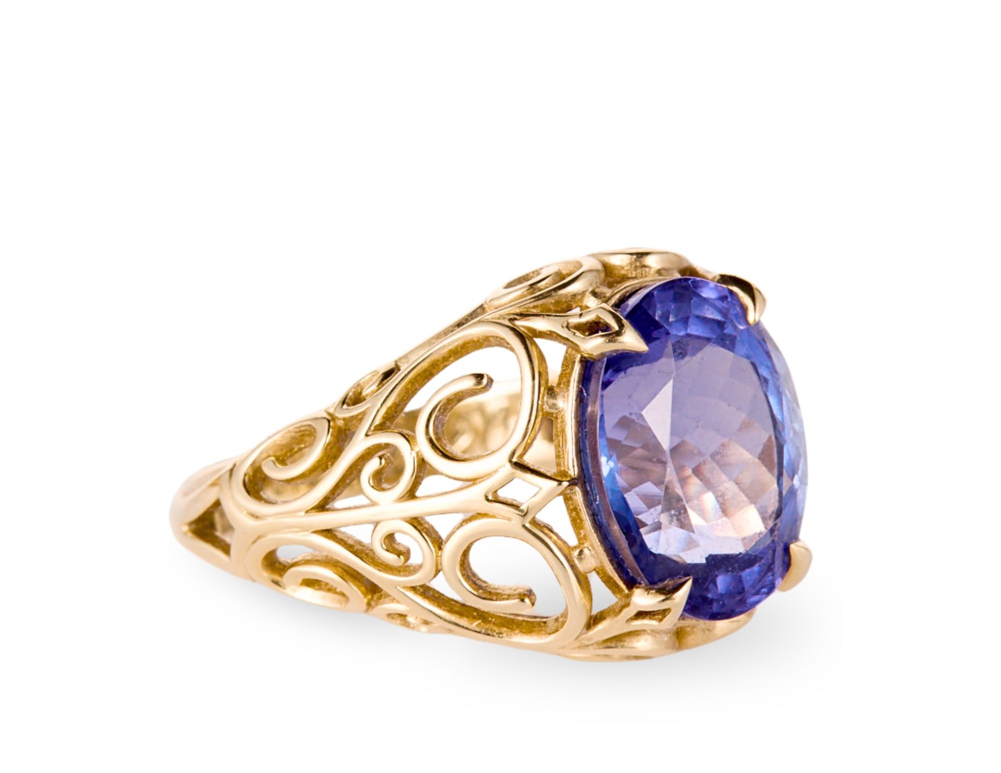 Pierścionek o ażurowej, dekoracyjnej formie z owalnym, fasetowanym tanzanitem o masie ok. 5,50 karata. Pierścionek wykonany w żółtym złocie próby 3, tj. 585, na rozmiar 13.
