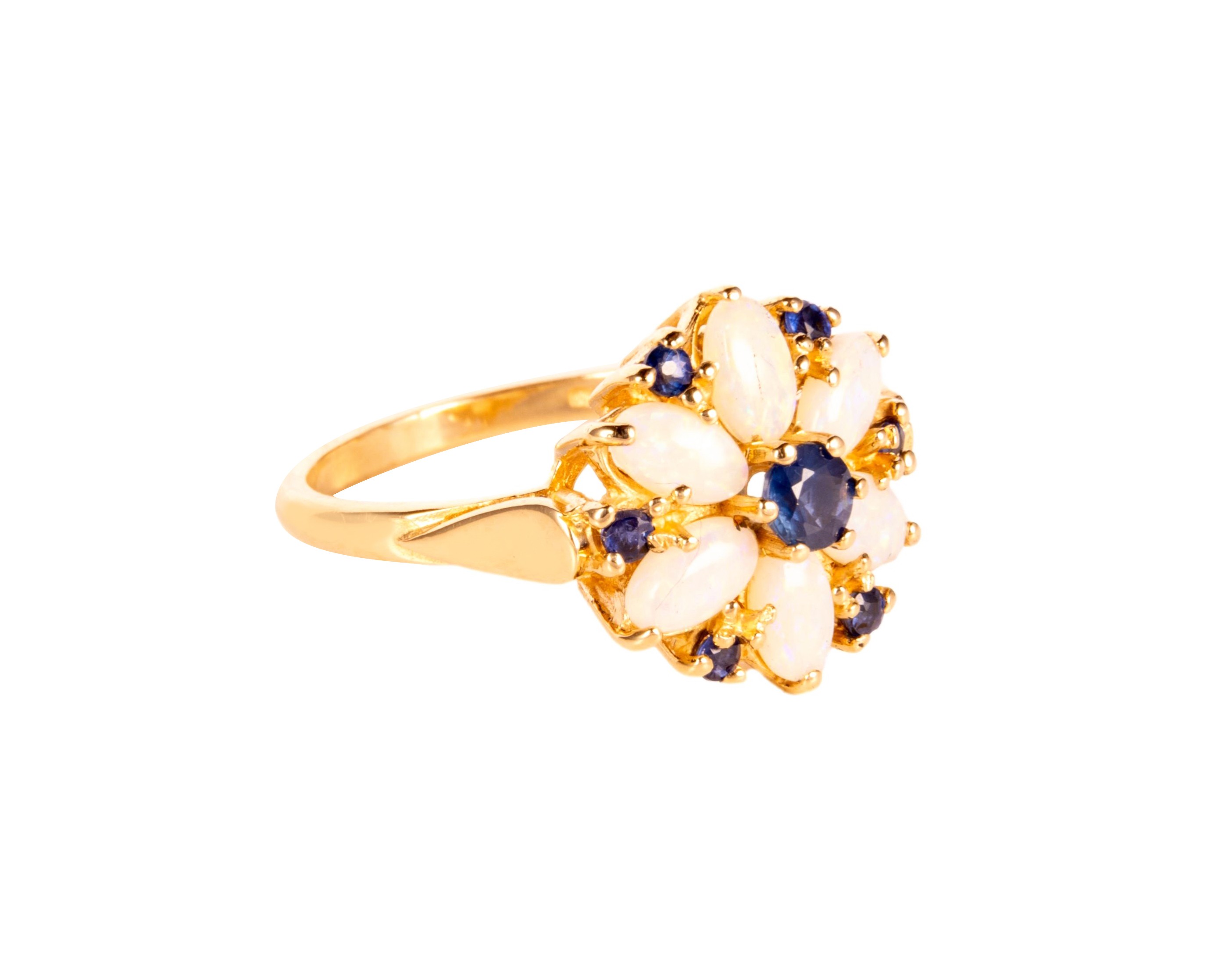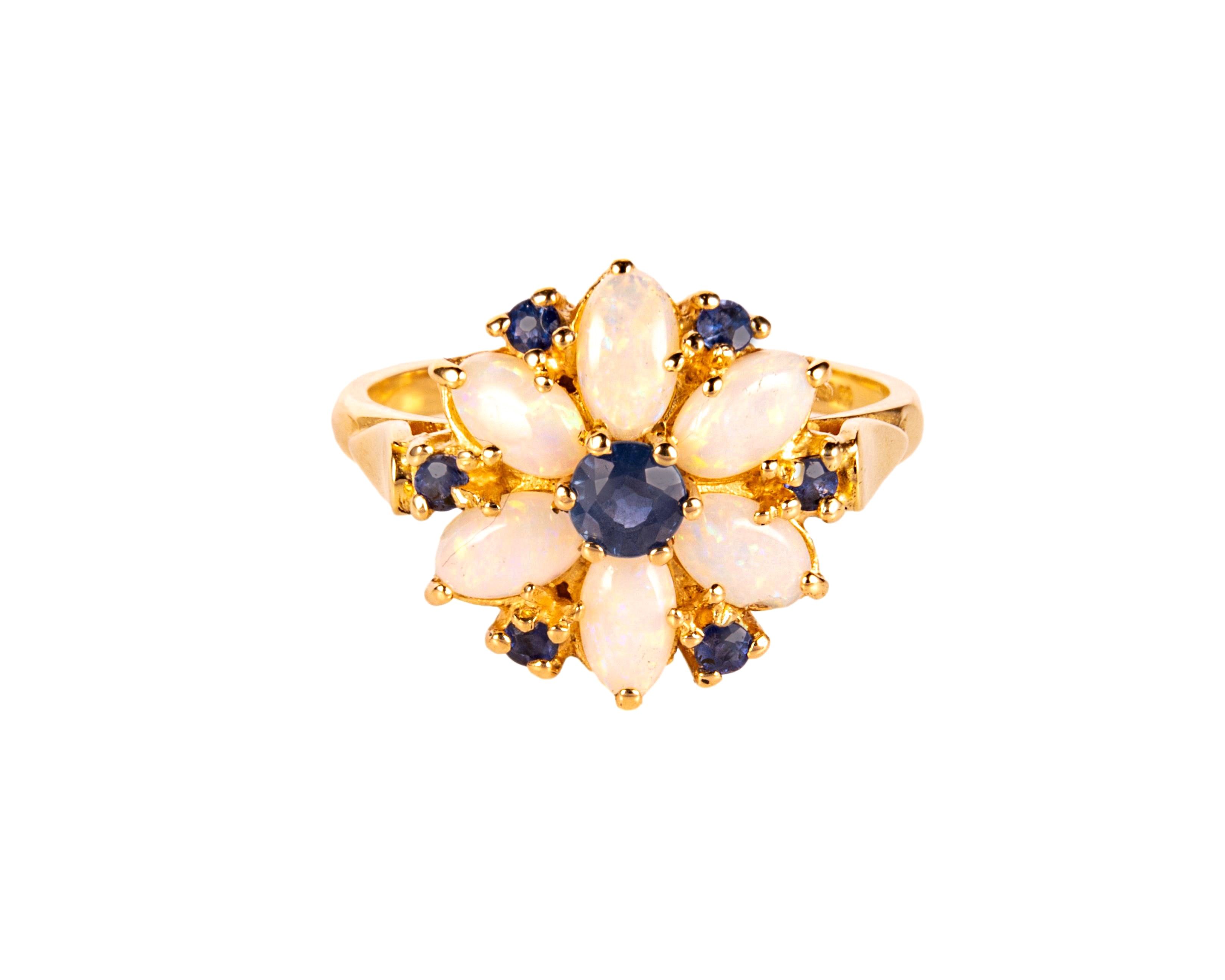 Uroczy pierścionek wykonany w żółtym złocie próby 3, tj. 585, na rozmiar 12,5. W pierścionek zakuto opale i szafiry - ułożone we wzór kwiatu. Siedem szafirów ma łącznie 0,45 ct, a 6 sztuk opali ok. 1 karata.