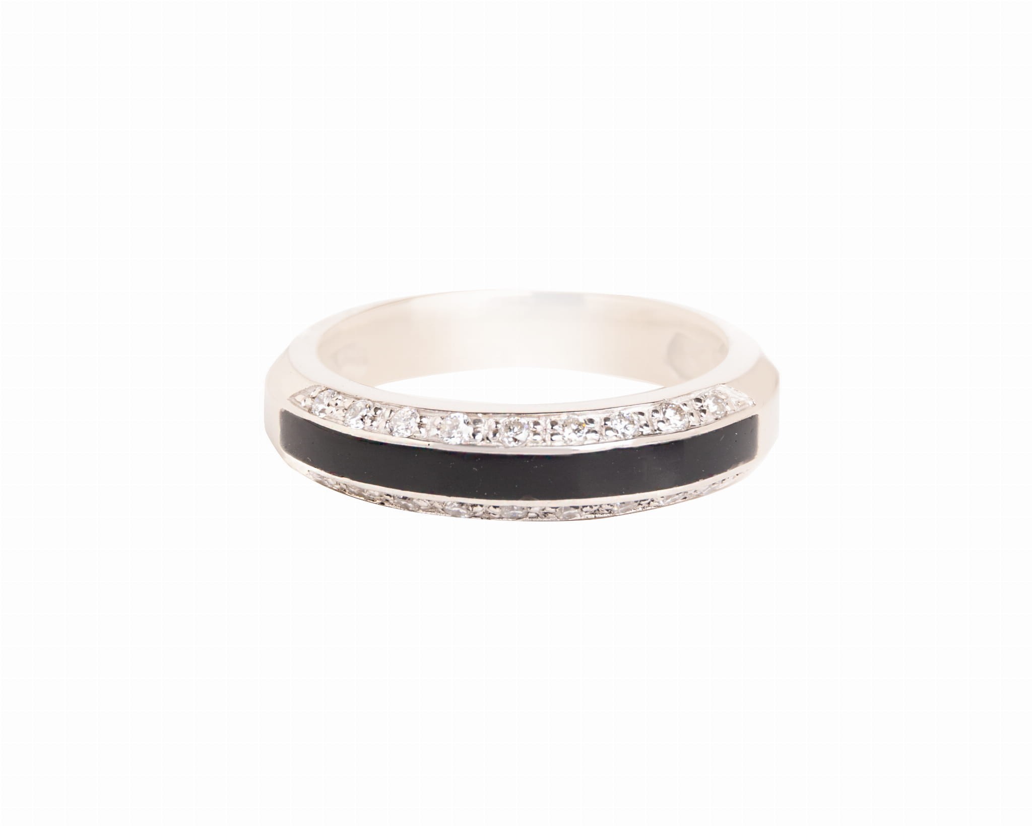 Elegancki pierścionek w formie obrączki wysadzanie dwoma rzędami 18 diamentów o łącznej masie ok. 0,3 karata, i środkowym pasem wypełnionym czarną emalią. Całość wykonana w białym złocie 3 próby, na rozmiar 18.