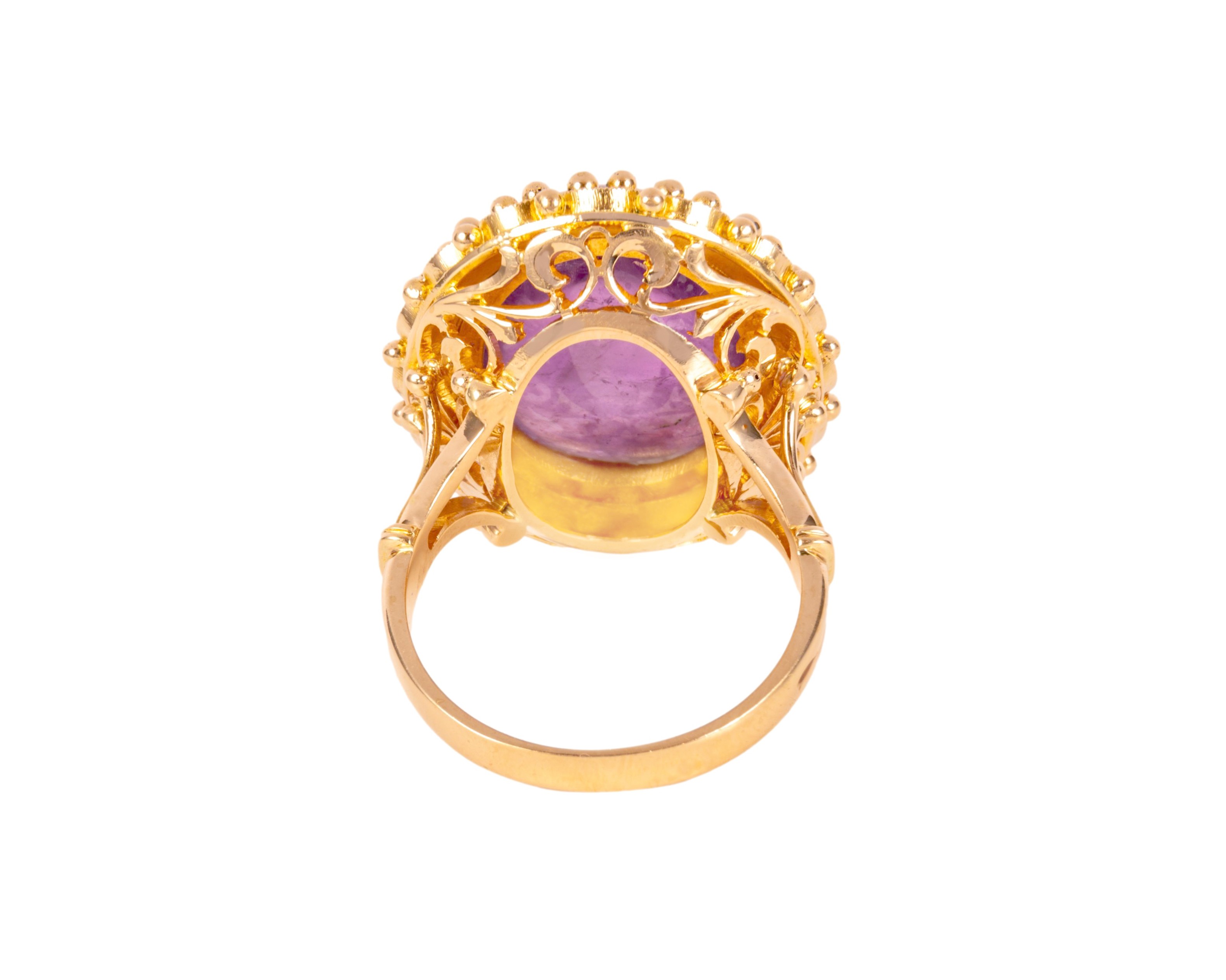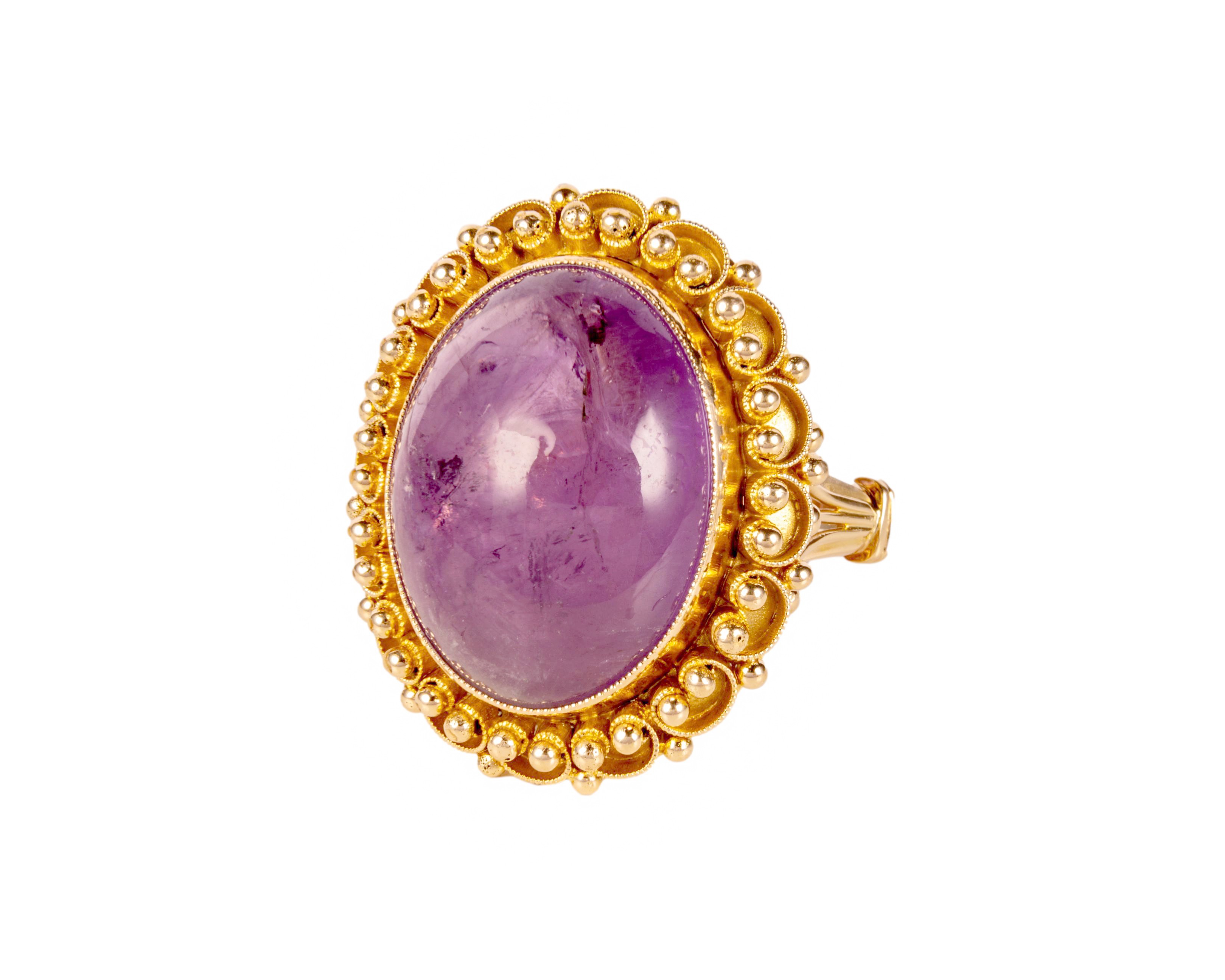 Złoty pierścionek z ametystem w szlifie kaboszonowym o masie ok. 22 karatów, z ozdobnie opracowaną górką i spodem oprawy kamienia. Pierścionek wykonany w żółtym złocie, na rozmiar 22.