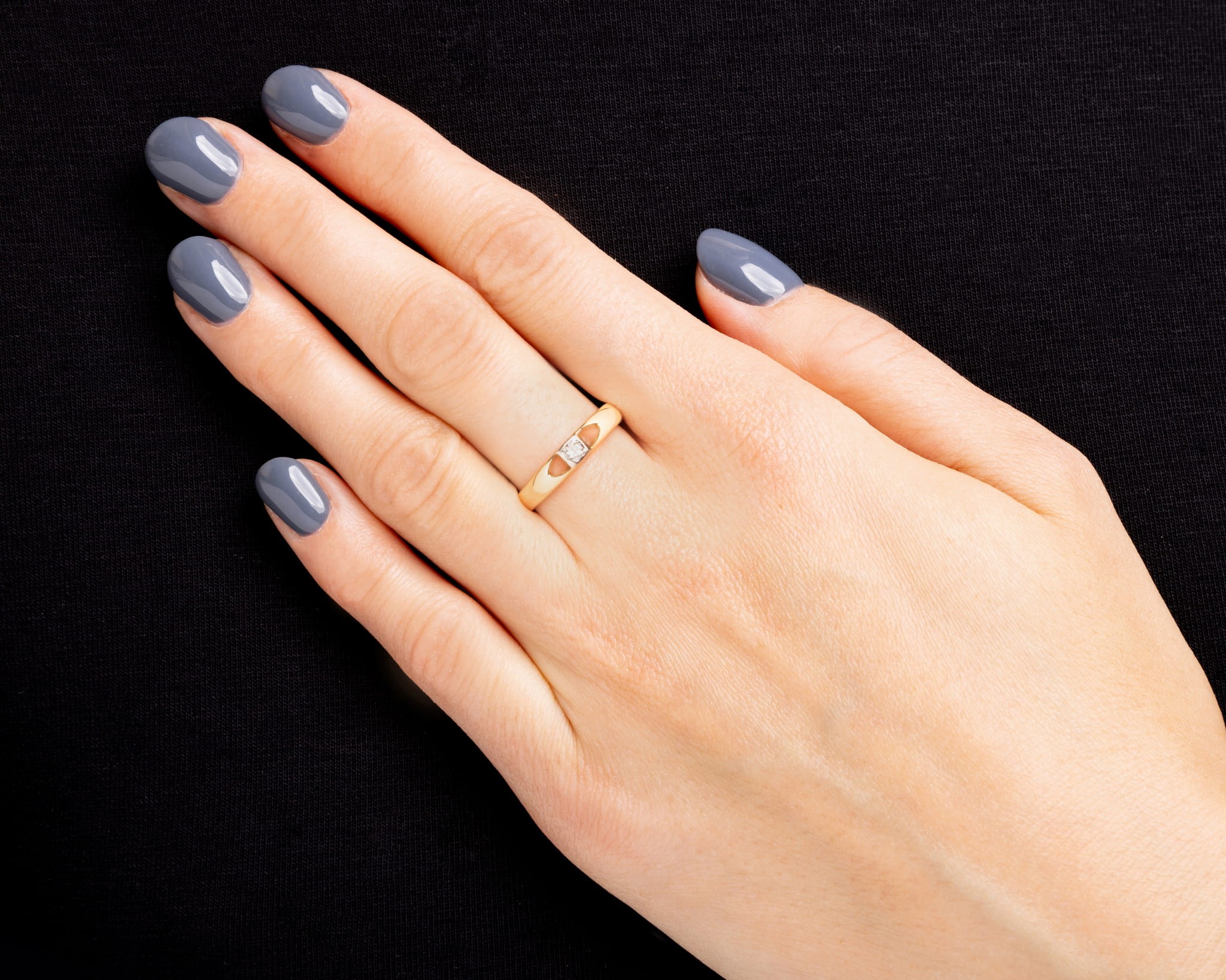 Pierścionek z brylantem zakutym w obrączce, w platynowej oprawie. Przybliżona masa diamentu to 0,10 karata, jego czystość to VS2, a barwa H. Pierścionek wykonany w żółtym złocie wysokiej 2 próbie, tj. 750. Pierścionek idealny dla zwolenniczek pierścionków z nieodstającymi kamieniami.
