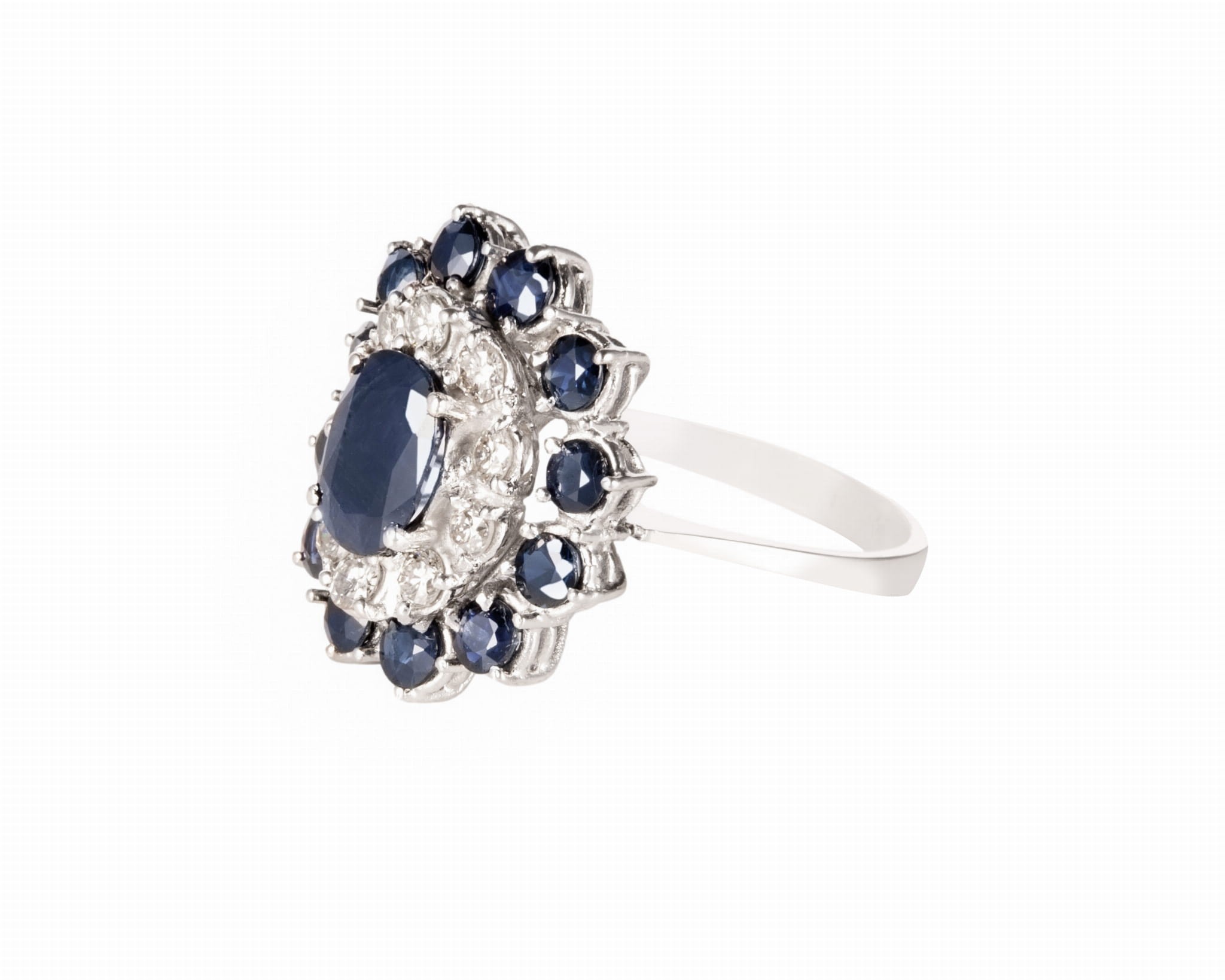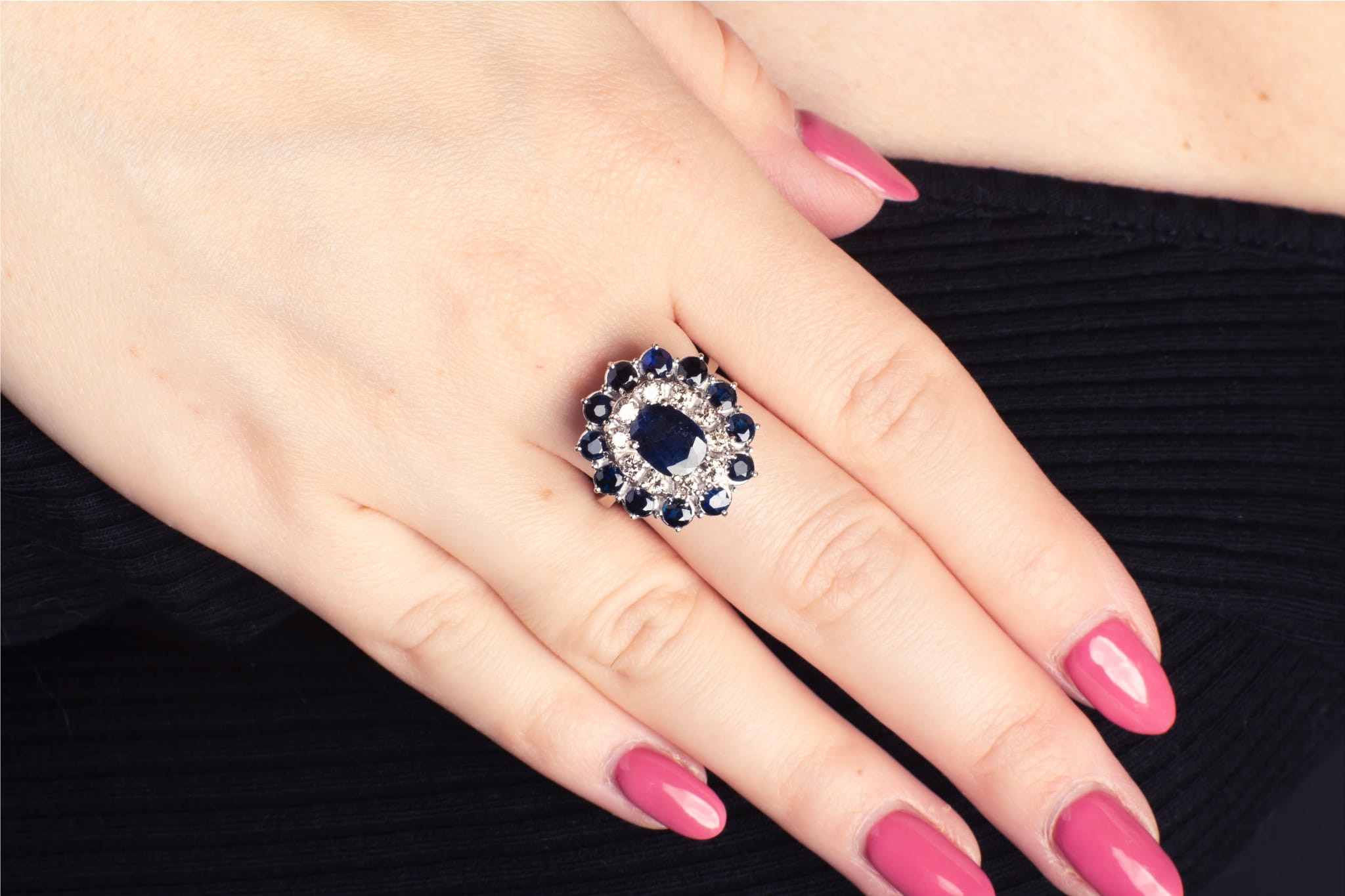 Złoty pierścionek z centralnym szafirem 0,9 ct i diamentami szafirami wokoło