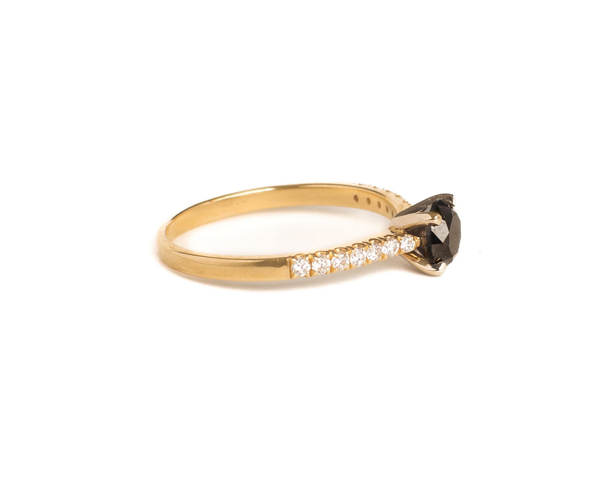 Wybór wszystkich fanów klasyki - pierścionek z żółtego złota z diamentami. Centralny diament jest w pięknym, czarnym kolorze. Na szynie znajdują się mniejsze, klasyczne białe diamenty. Możemy wykonać takie pierścionki w różnej konfiguracji diamentów - skontaktuj się z nami!