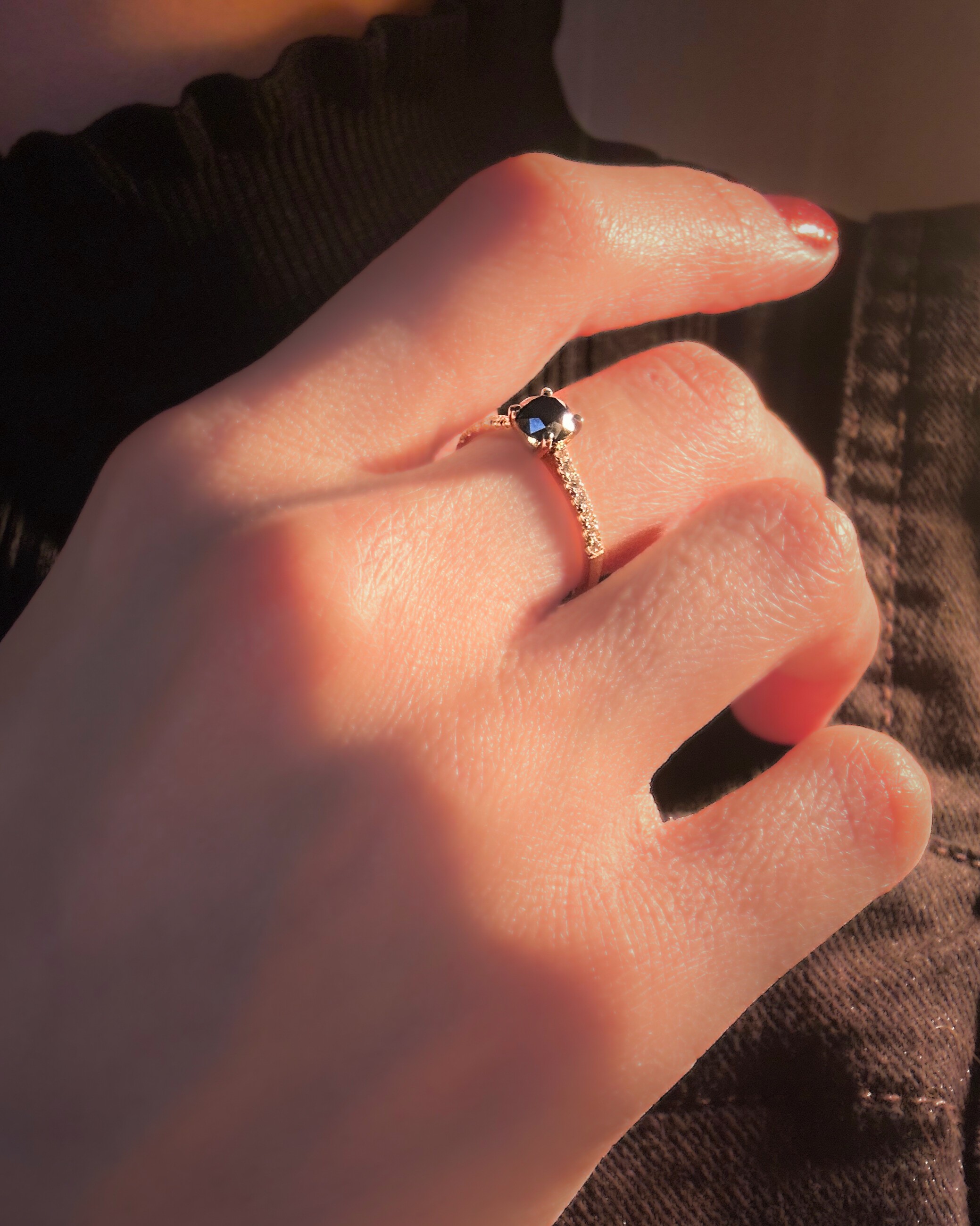 - Połączenie czarnego diamentu z białymi diamentami tworzy elegancki kontrast — czar odbija światło inaczej, nadając pierścionkowi wyjątkowego charakteru.