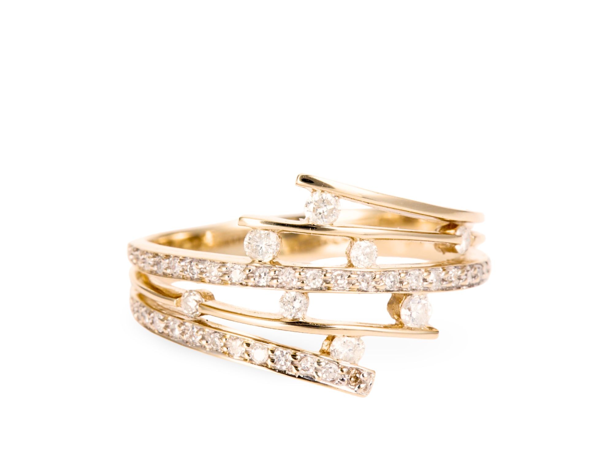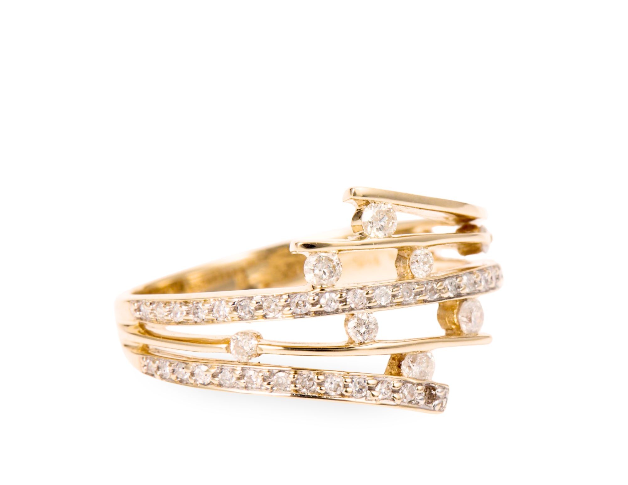 Pierścionek o lekkiej, ażurowej konstrukcji, w którą wkomponowano diamenty o łącznej masie ok. 0,40 karata. Czystość diamentów oceniono na Si, a ich barwę - H. Pierścionek wykonany w żółtym złocie próby 3, tj. 585, na rozmiar 18.