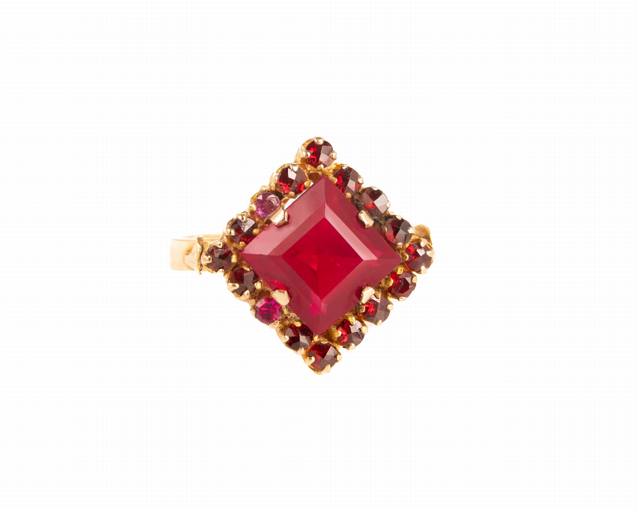 Złoty pierścionek z granatami zakutymi wokół centralnego kamienia - syntetycznym korundem.