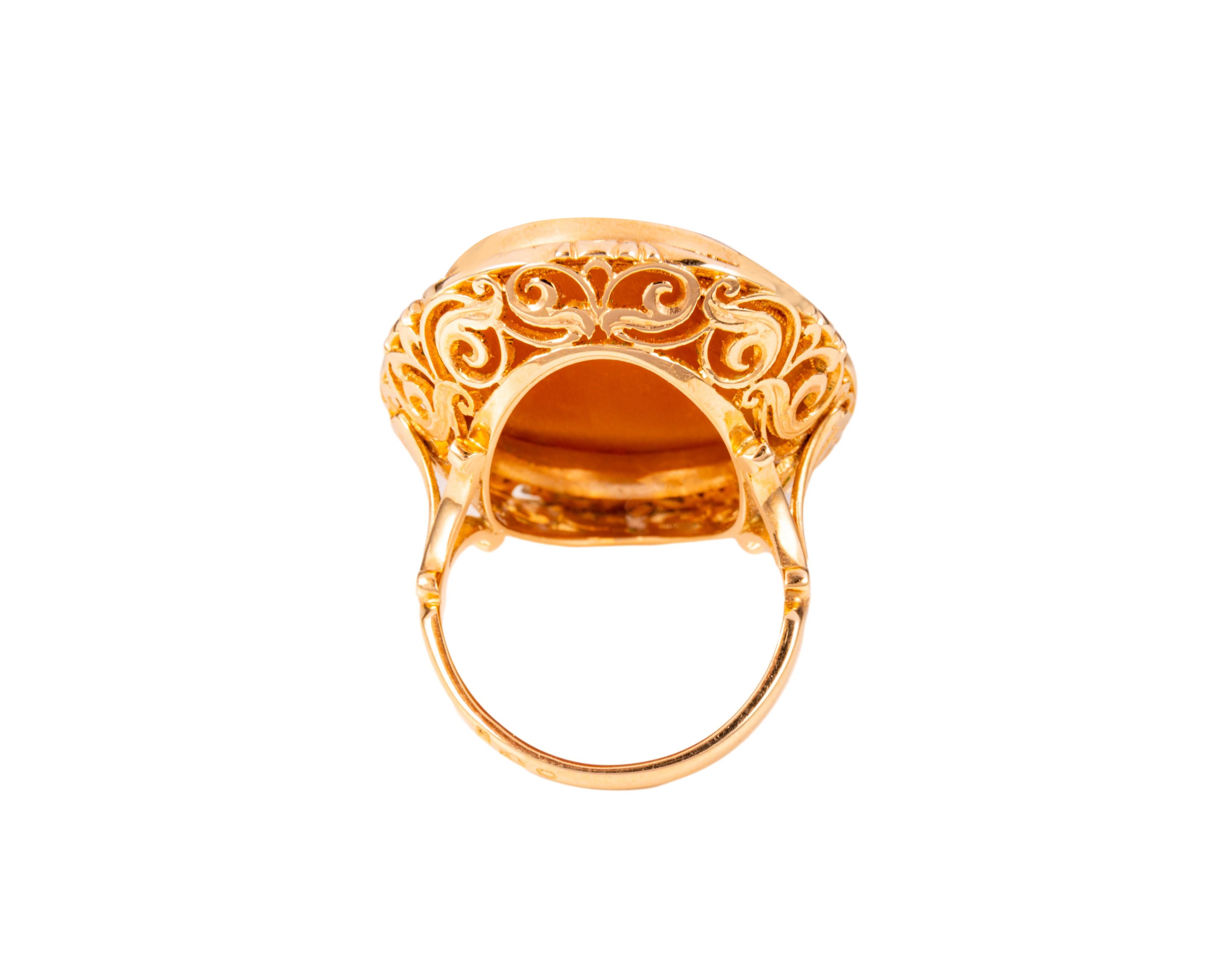 Pierścionek z kameą wyrzeźbioną w muszli i oprawioną w żółte złoto próby 3, t. 585. Oprawa kamei jak i spód kroony pierścionka udekorowano w roślinne motywy. Pierścionek wykonany na rozmiar 21.