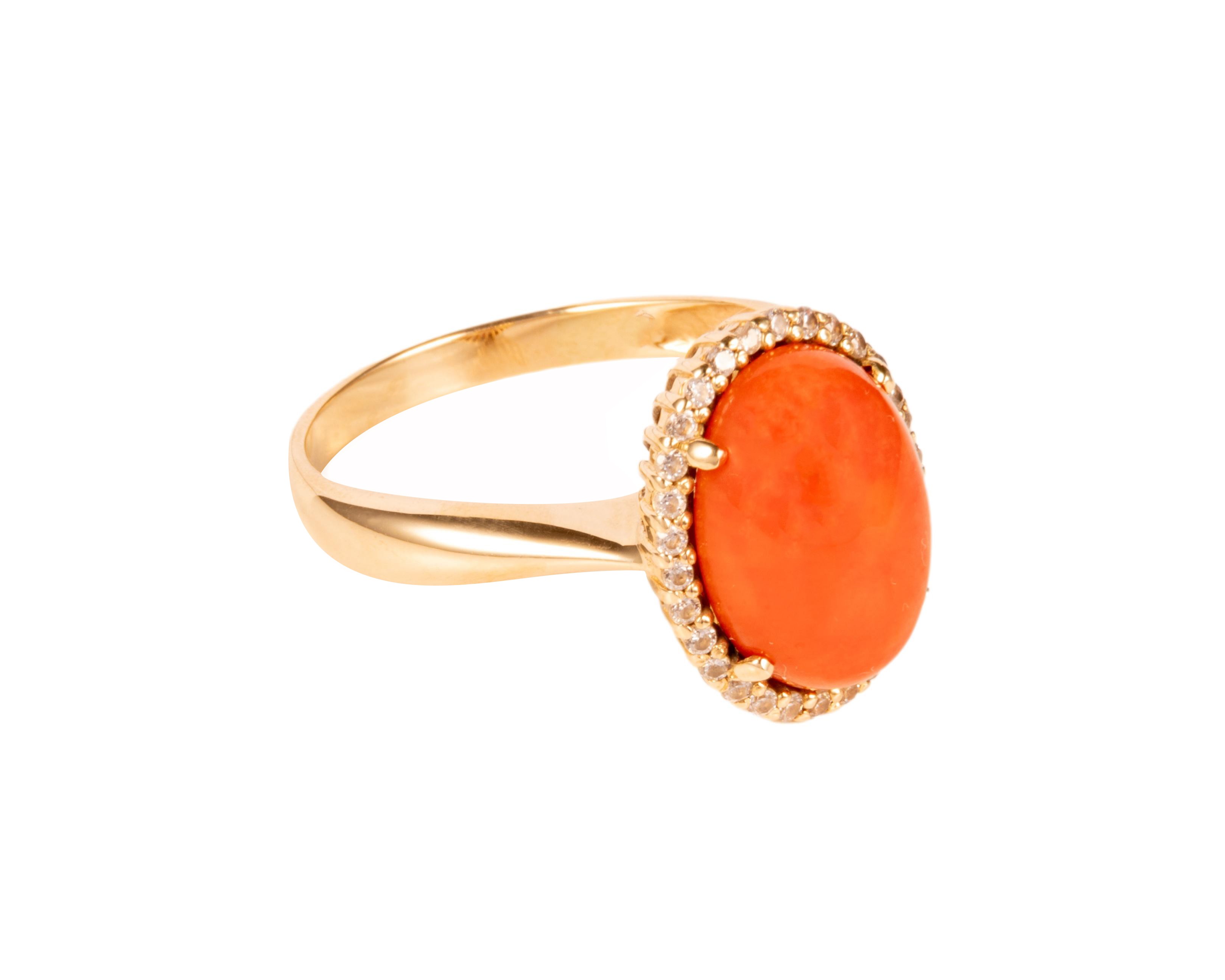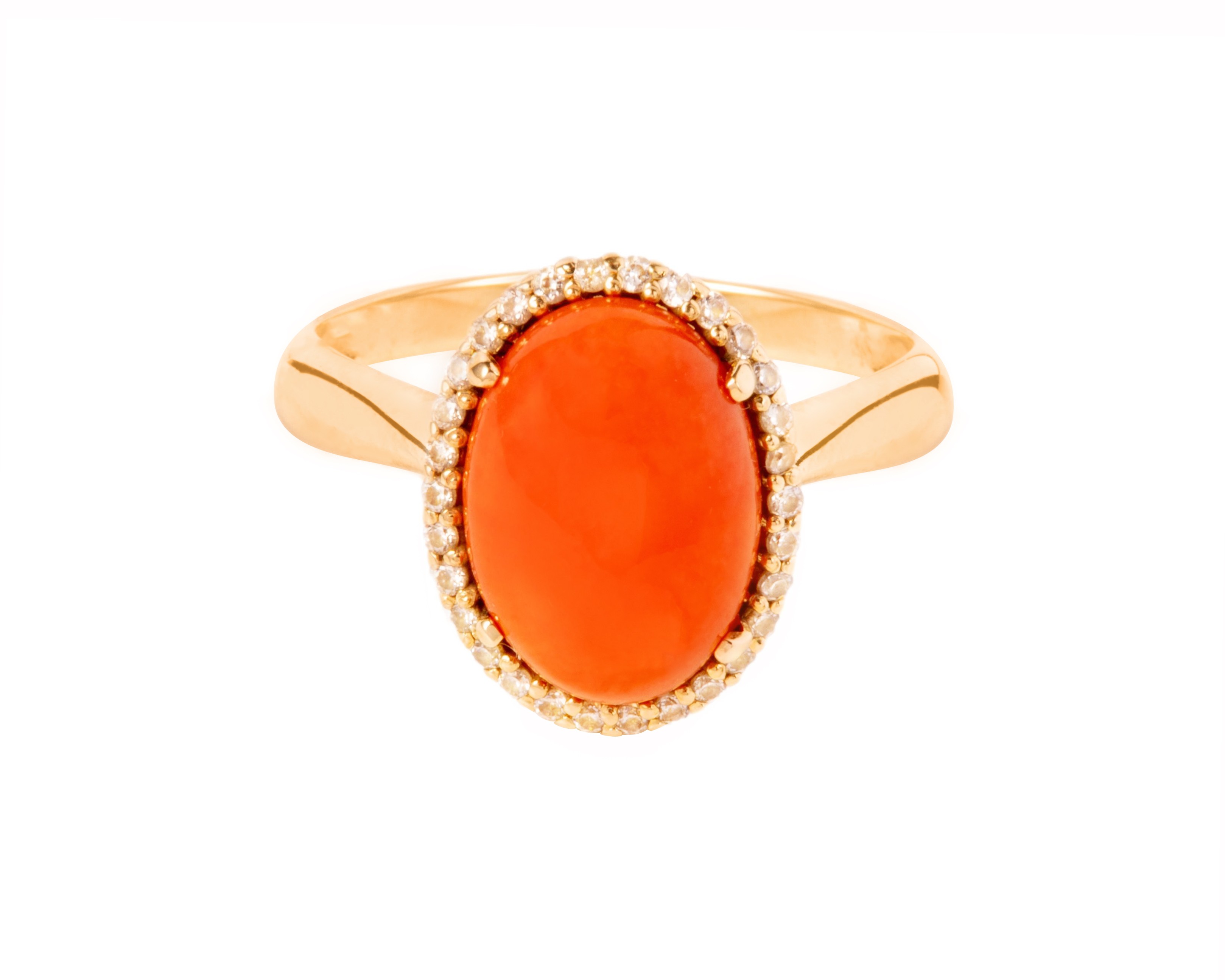 Pierścionek wykonany w żółtym złocie próby 3, tj. 585, na rozmiar 23. Z centralnie osadzonym koralem oraz karmazycją z cyrkonii.