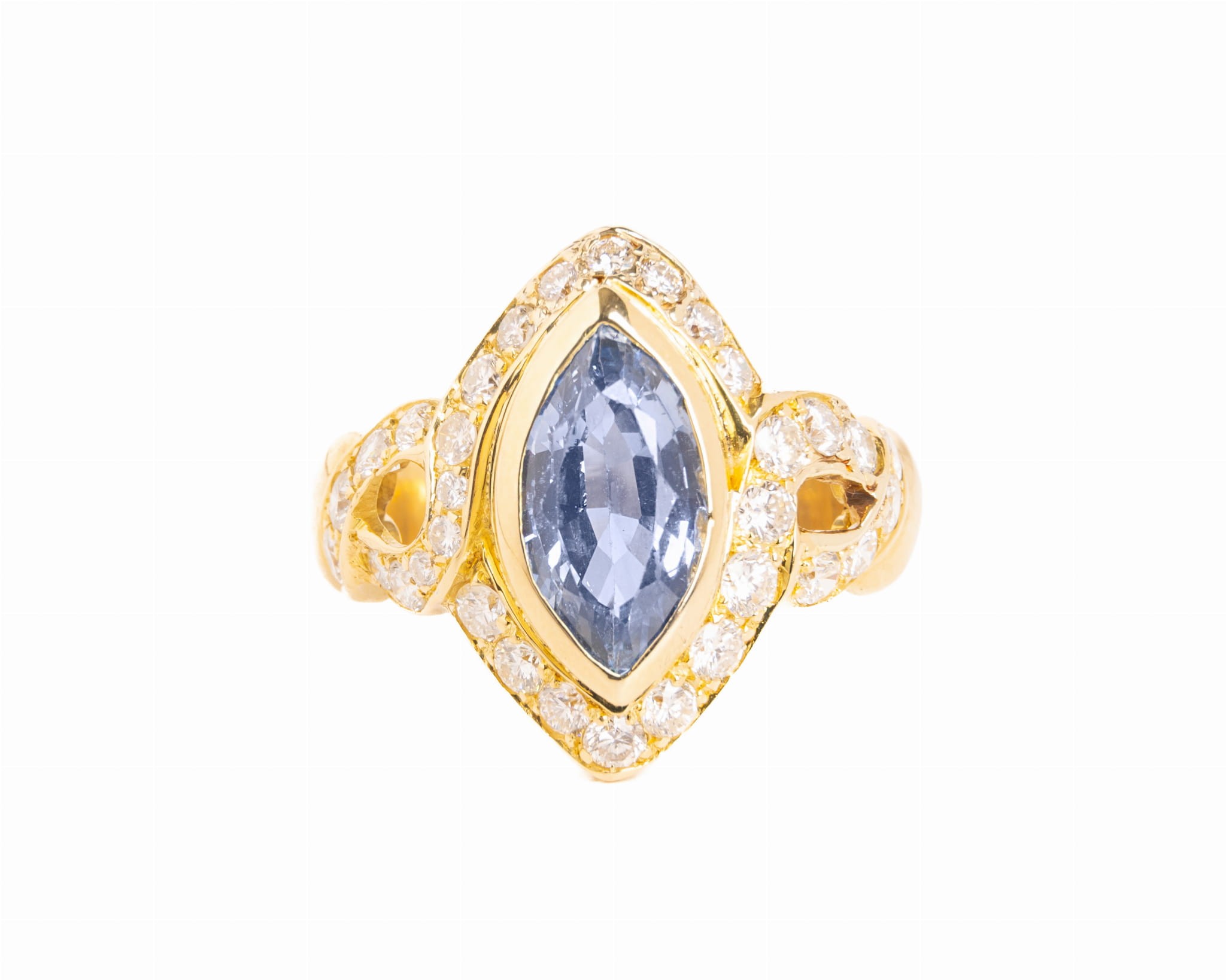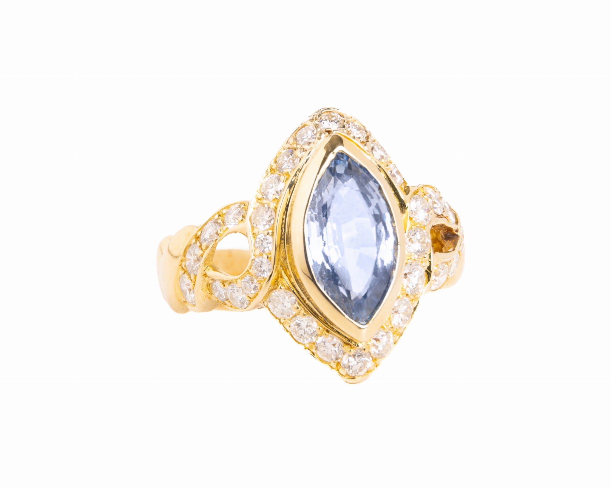 Pierścionek z 32 diamentami osadzonymi wokół szafiru o przybliżonej masie 3 karatów.