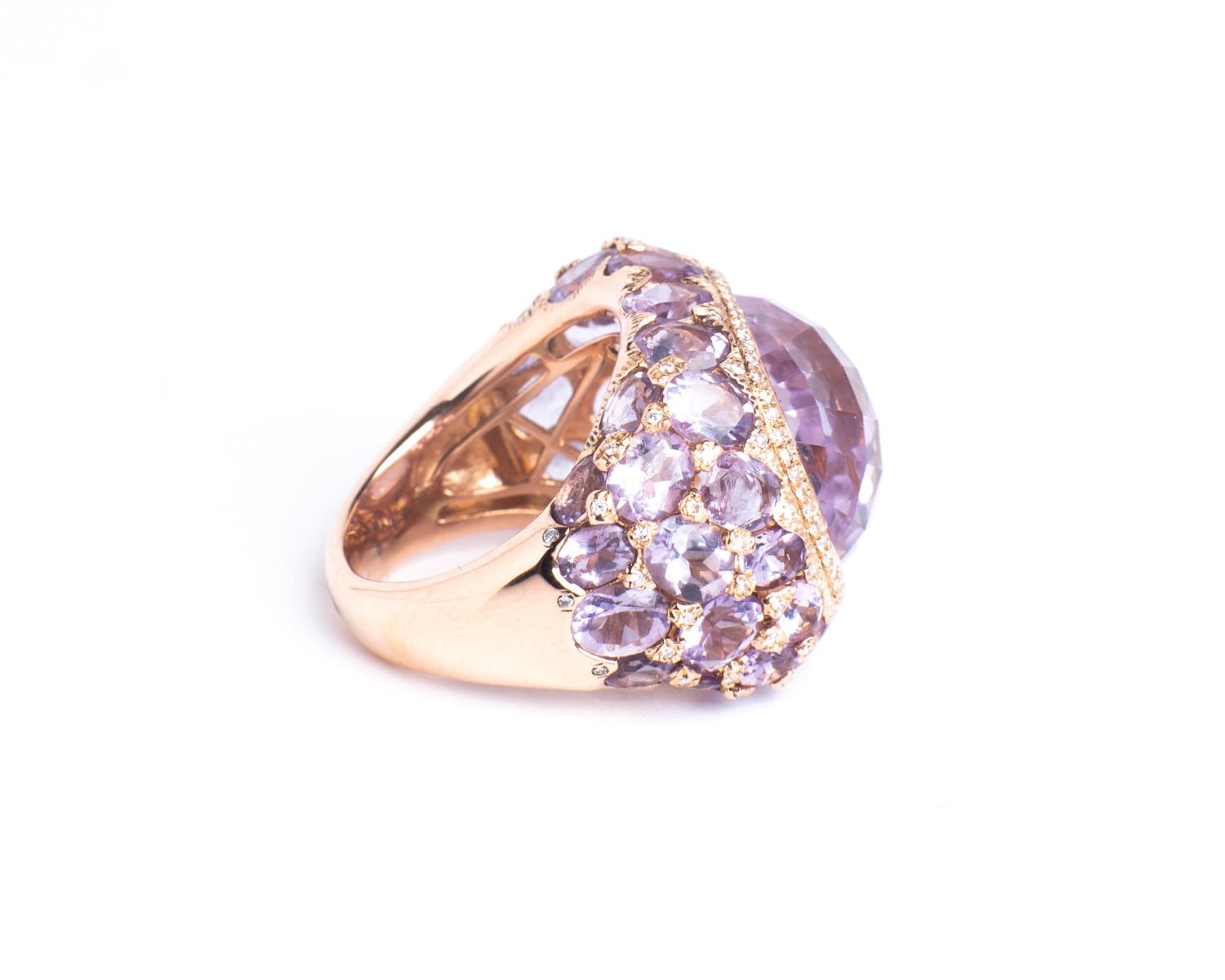 Przepiękna propozycja w różowej kolorystyce. Pierścionek został wykonany w złocie próby 2, różowego kwarcu oraz aż 116 diamentów. Ich łączna masa to aż 0,50 ct. Iście królewska propozycja.