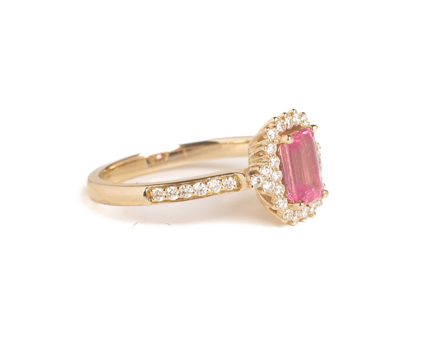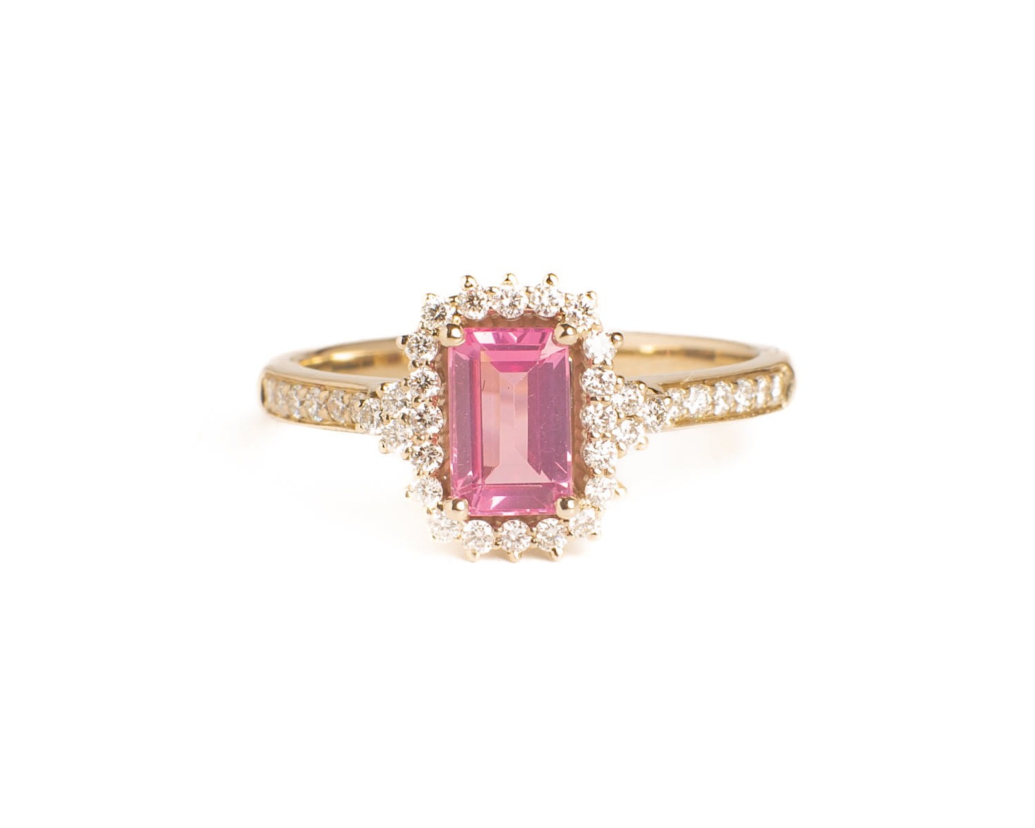 Pierścionek z żółtego złota z diamentami oraz szafirem z Madagaskaru o różowej barwie. Kamień centralny ma szlif szmaragdowy. Diamenty osadzone są wokół kamienia oraz na szynie.