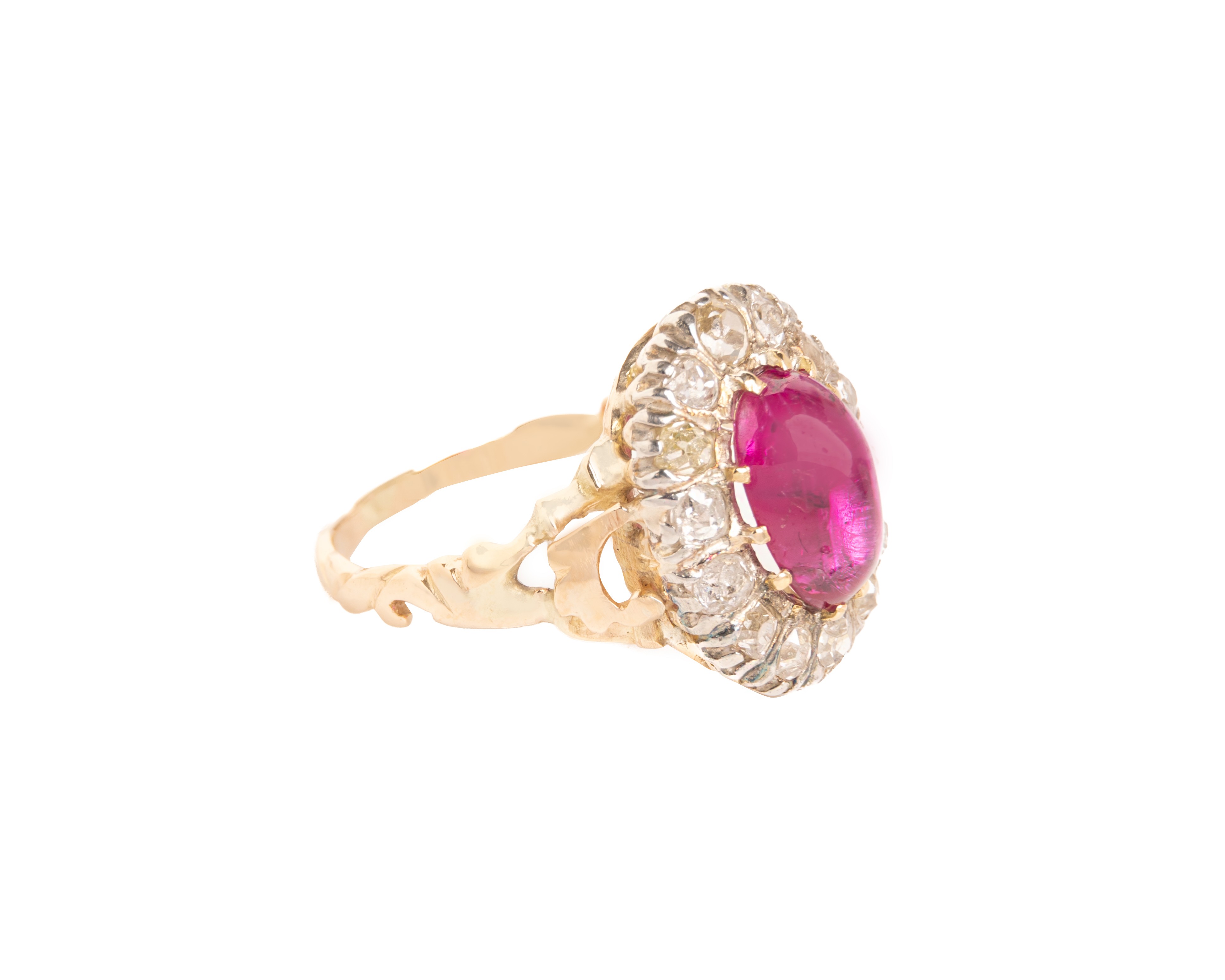 Królewski pierścionek z rubinem kaboszon – złoto i srebro, 14 diamentów