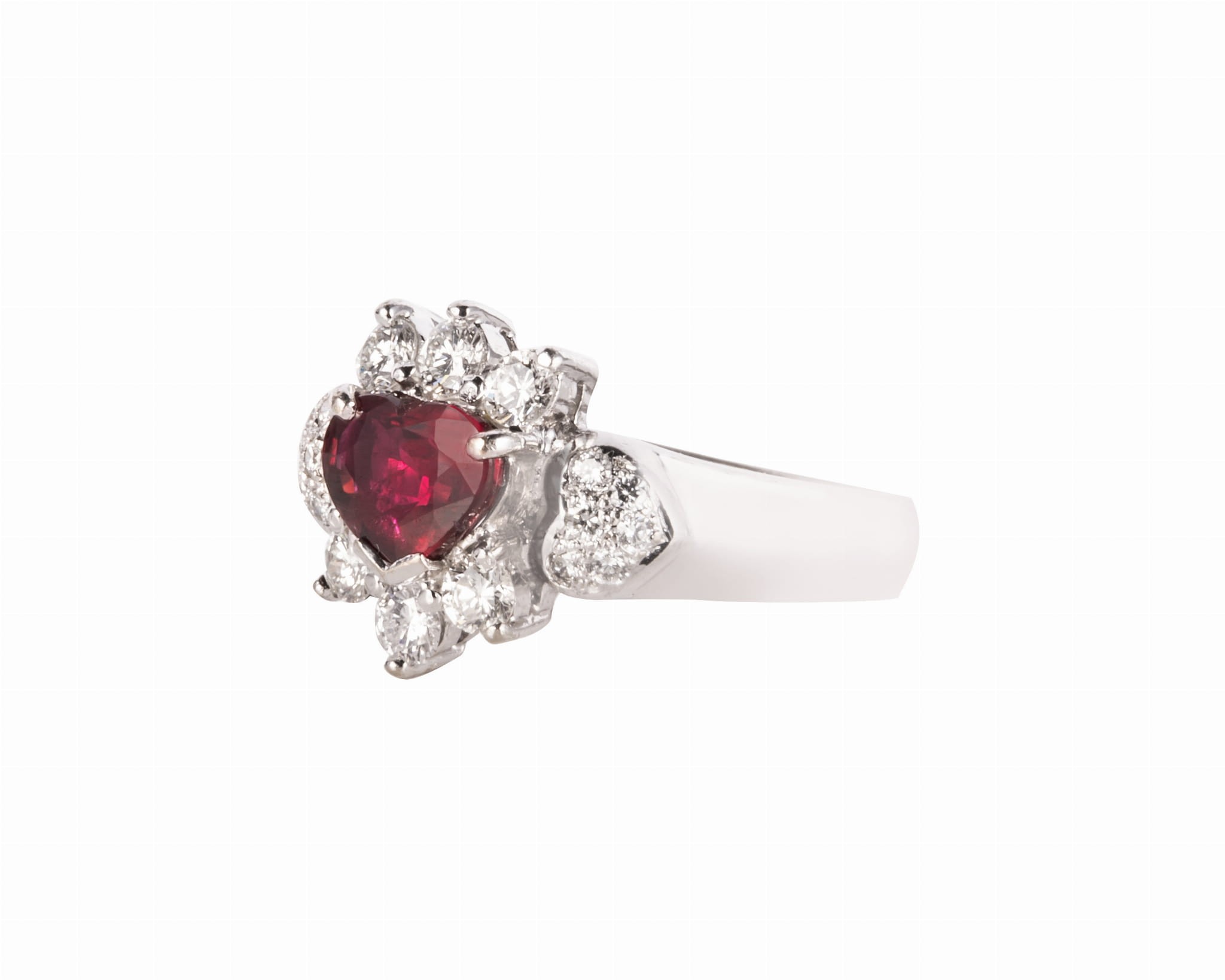 Pierścionek wykonany w białym złocie próby 750, z centralnie zakutym rubinem masy ok. 0,85 karata, oszlifowanym w kształt serca. Dookoła centralnego kamienia zakuto 18 diamentów o łącznej masie ok. 0,48 karata, czystości VS i barwy w przedziale G-H. Pierścionek ma rozmiar 10.