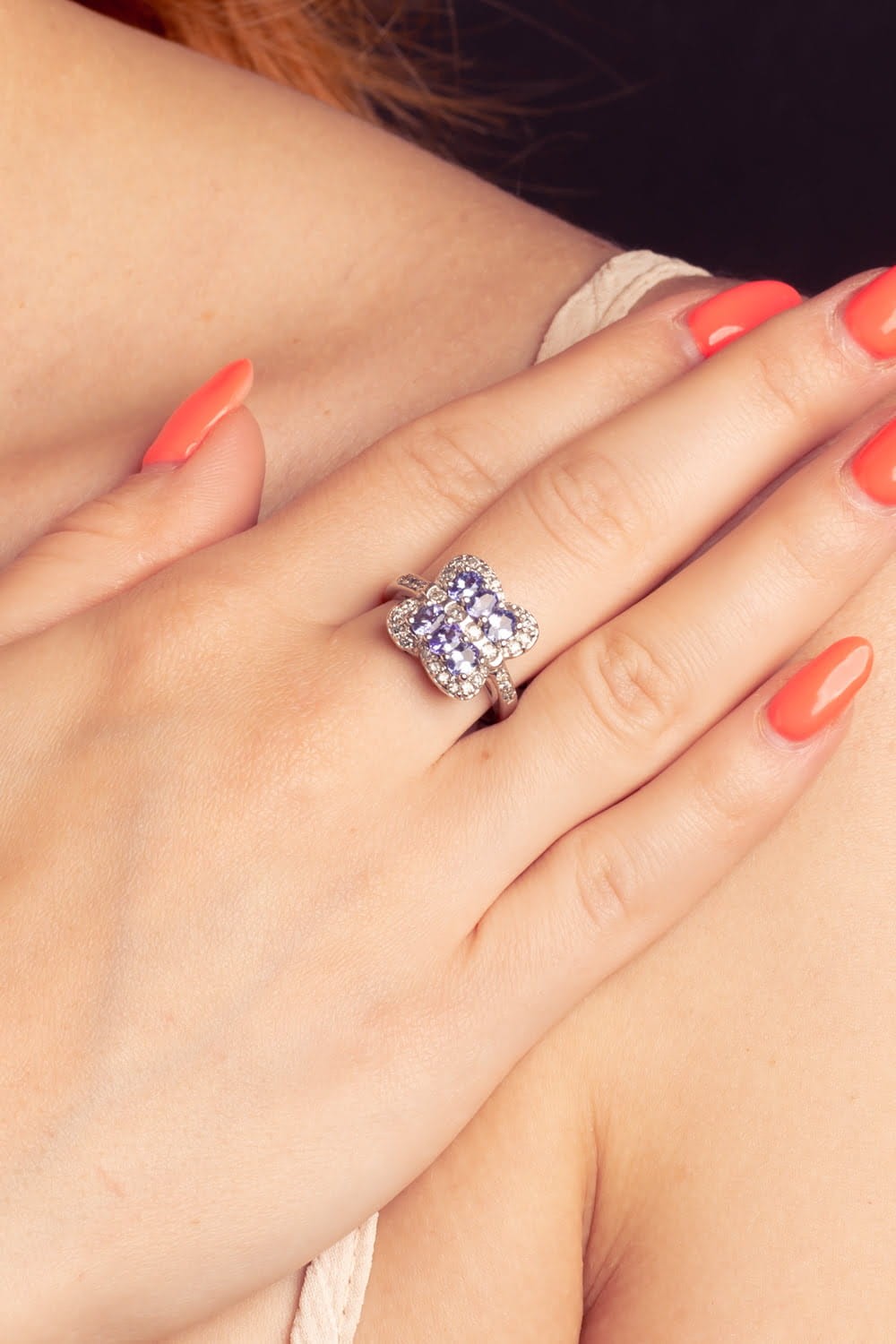 Pierścionek w białym złocie z kamieniami szlachetnymi - tanzanitami i diamentami w łagodnej, pastelowej barwie. Tanzanity mają owalny kształt. Diamenty osadzone są na szynie pierścionka.