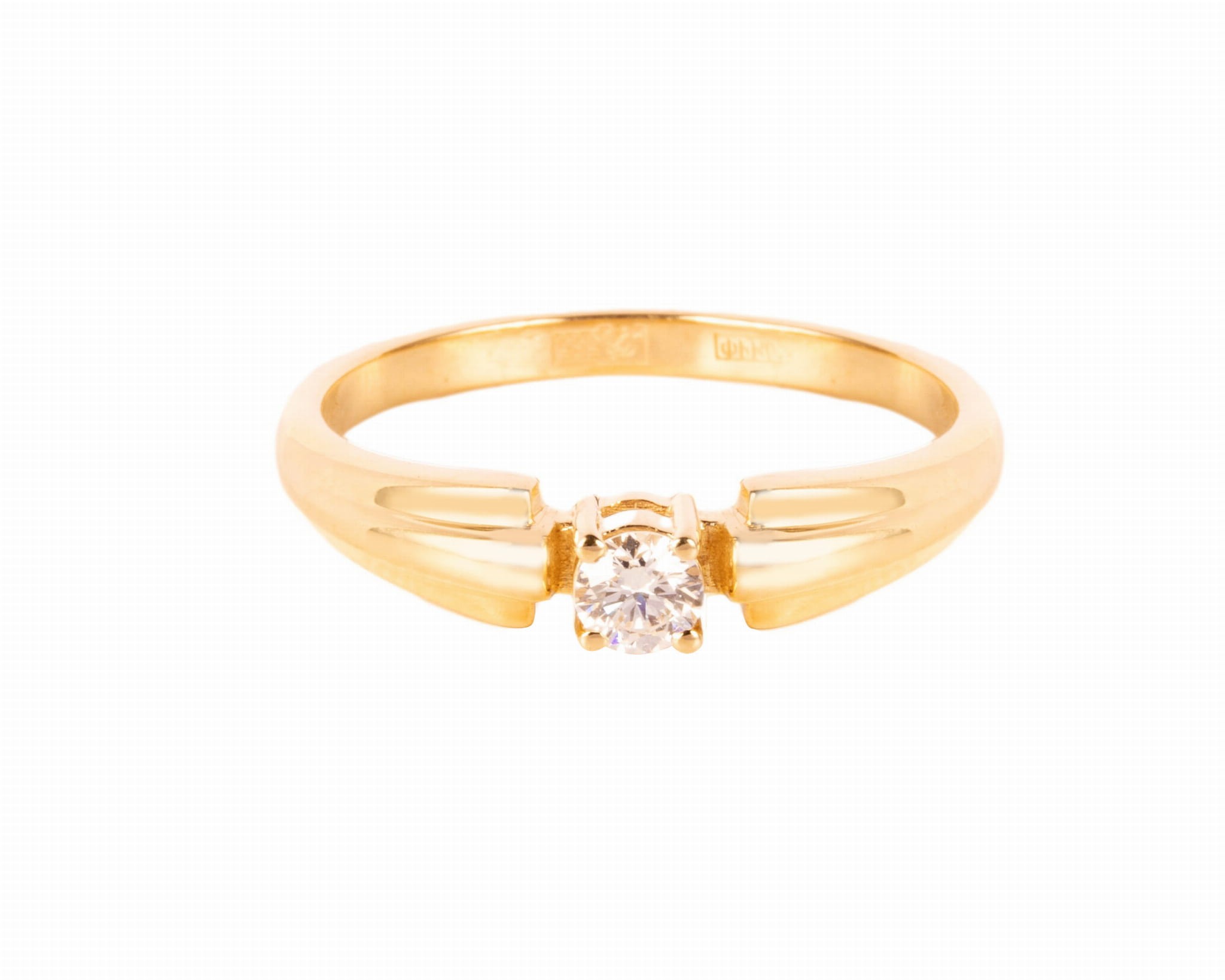 Pierścionek z centralnie osadzonym diamentem o masie ok. 0,20 karata, czystości VS oraz barwie E. Całość wykonana z żółtego złota próby 585. Pierścionek ma rozmiar 17, może posłużyć jako klasyczny pierścionek zaręczynowy.