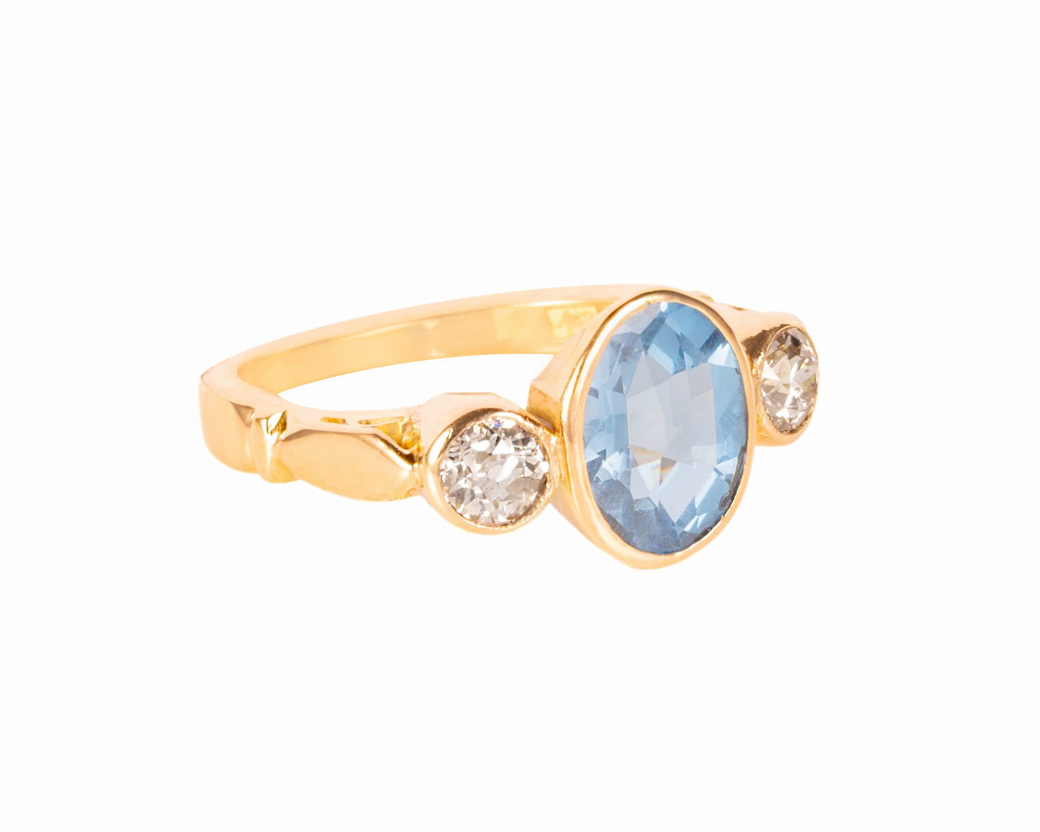 Pierścionek z centralnie osadzonym niebieskim spinelem syntetycznym o masie ok. 2,30 karatów oraz dwoma diamentami o łącznej masie ok. 0,50 karata. Całość wykonana w żółtym złocie próby 3, tj. 585, na rozmiar 12.