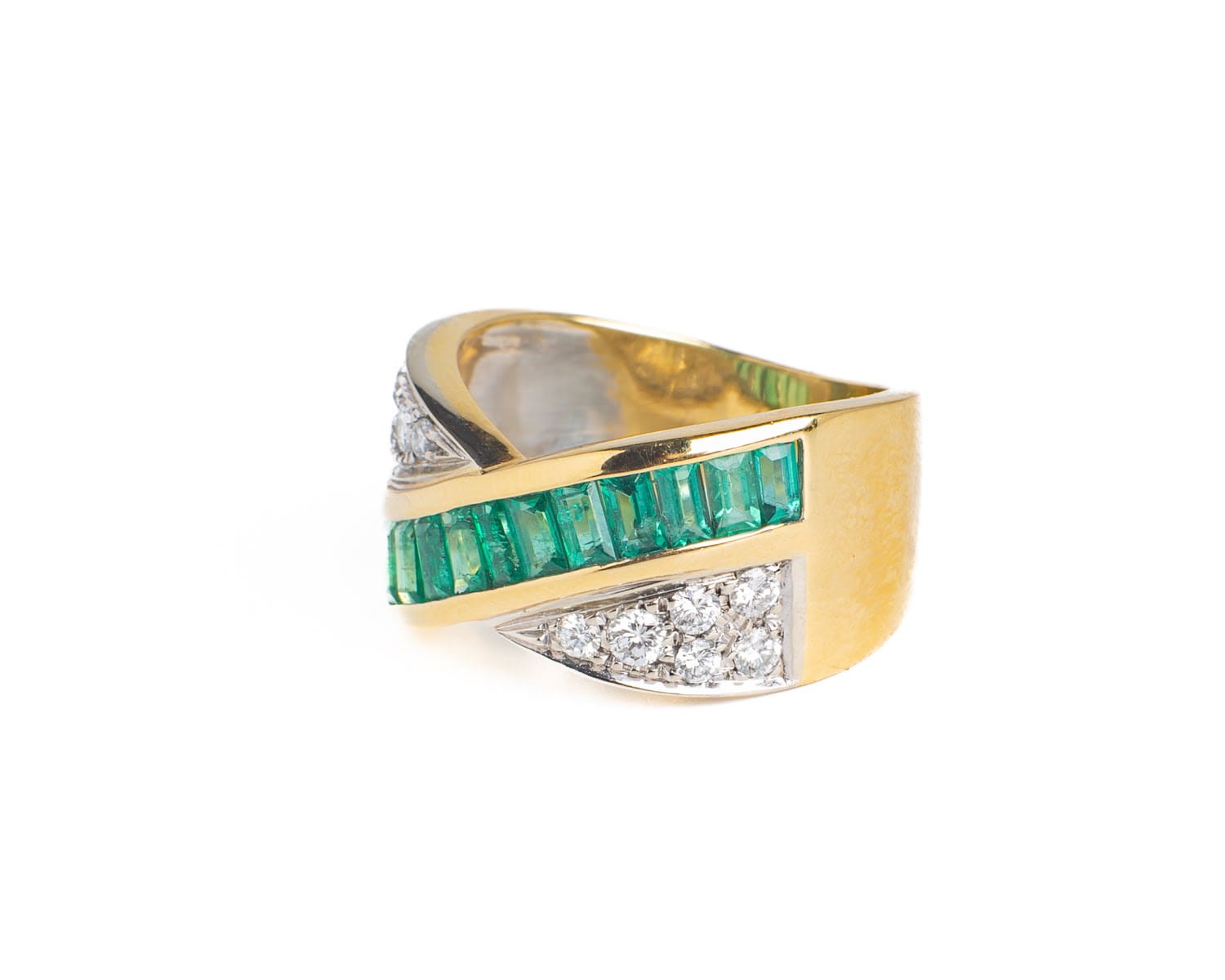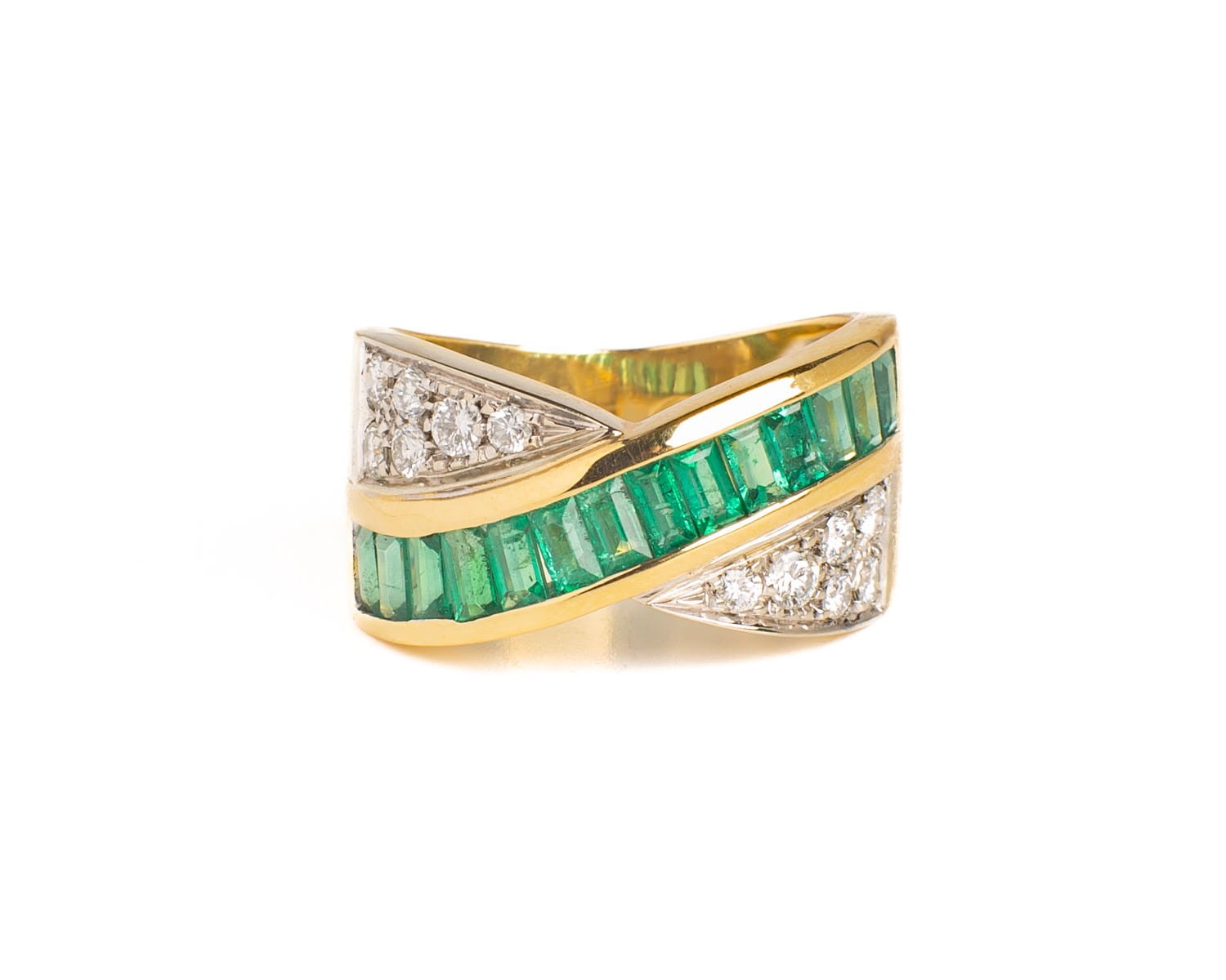 Pierścionek typu obrączka ze szmaragdami o szlifie bagietowym i diamentami. Kamienie przepięknie się przeplatają stanowiąc zgraną kompozycję.